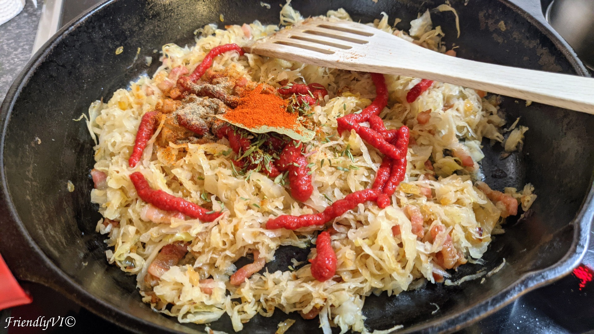 - Once the cabbage is golden you can add: the dissolved beef stock, sweet and spicy paprika, tomato paste, thyme, salt and pepper to taste. Be careful with the salt – the cabbage and stock are already salty, so you most probably won’t need to add any extra salt.