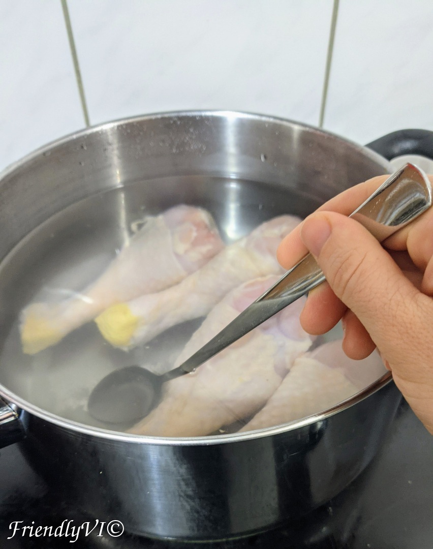 1. In 2.5 l of water start boiling the meat with 1 tsp of salt.