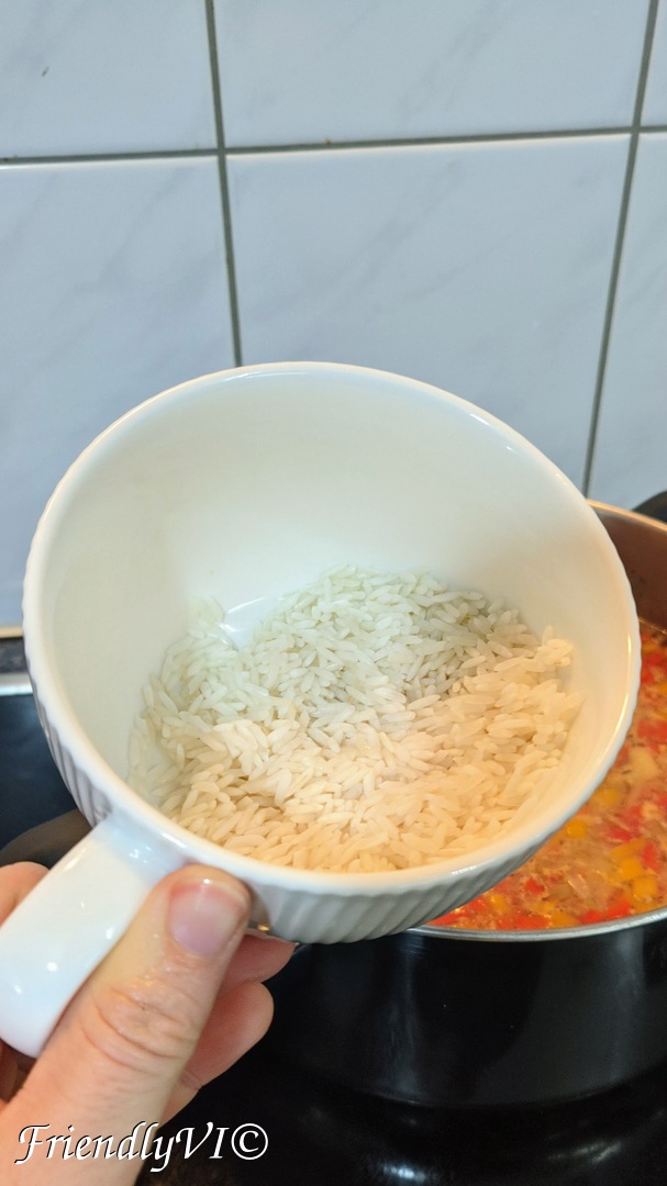 6. After 10 min of boiling, add the rice and the clean meat.
