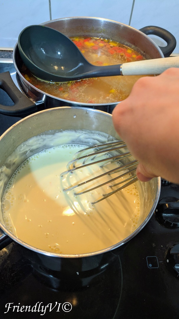 8. Add in the well mixed sour cream liquid from the soup to temper it. Add continuously and mix well until you add 1/3.
