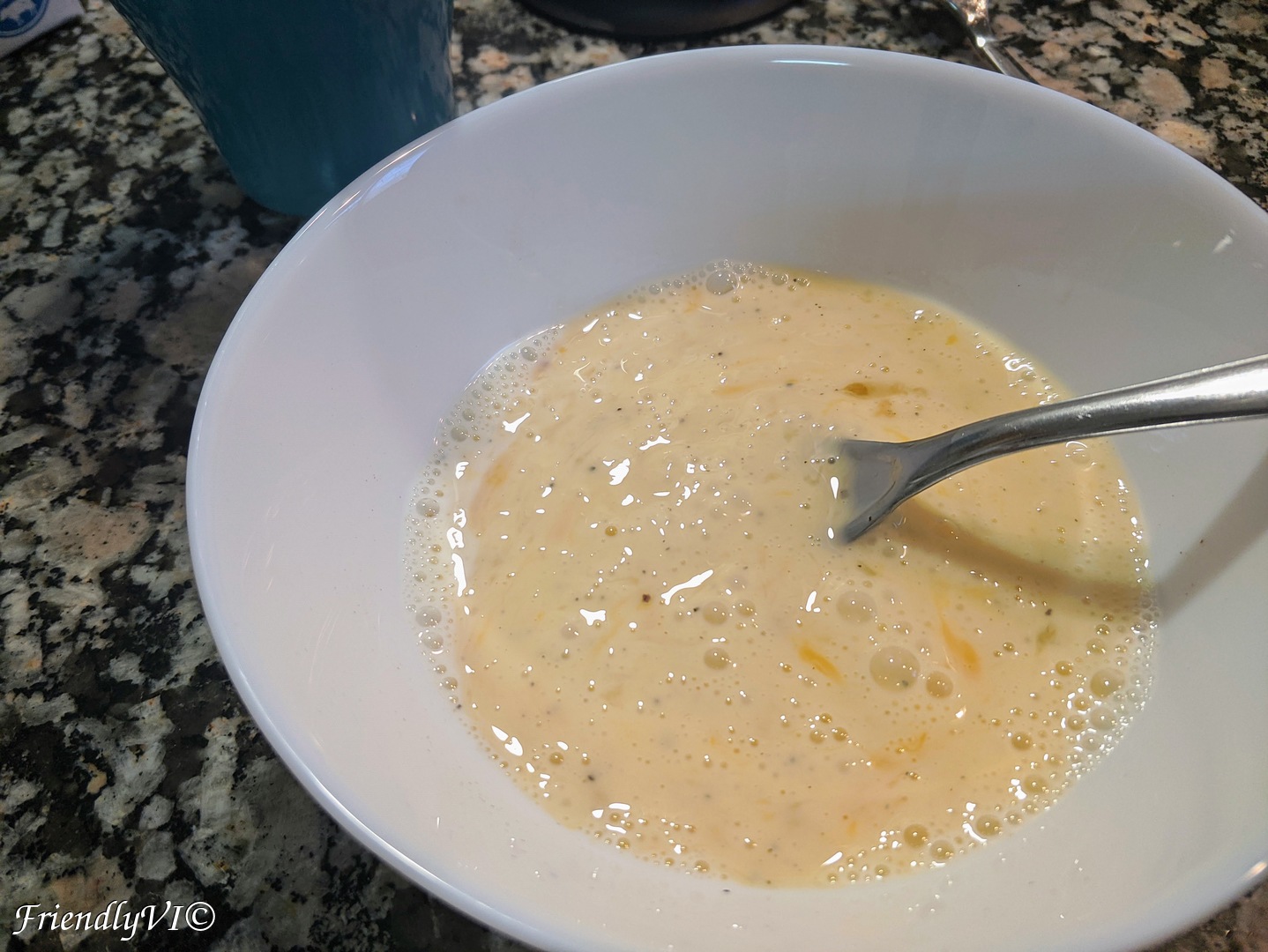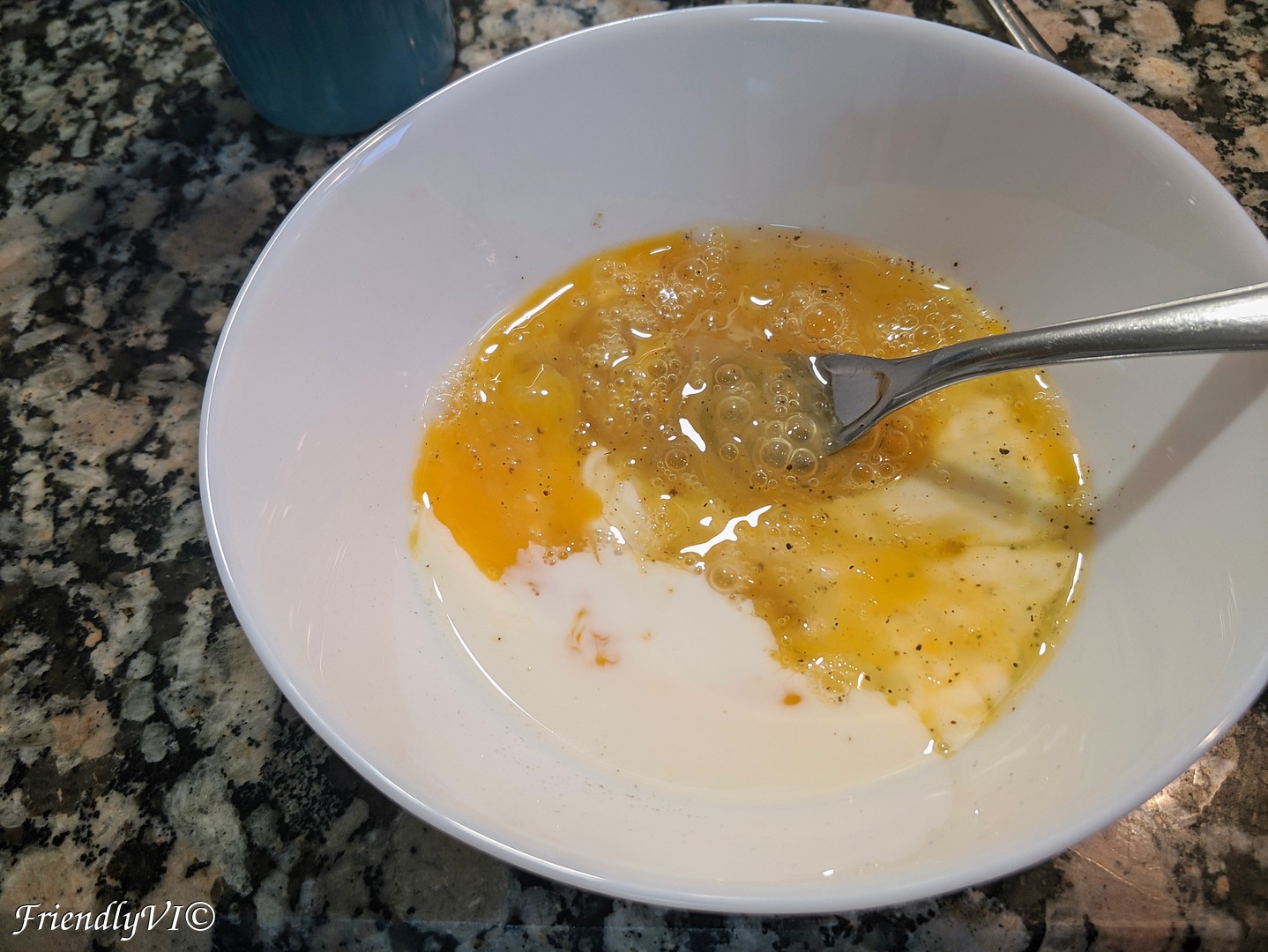 - Add in the milk – the addition of milk will change the consistency of the omelette, but also give it a nice milky taste. Plus, you save one egg. Add the salt and pepper.