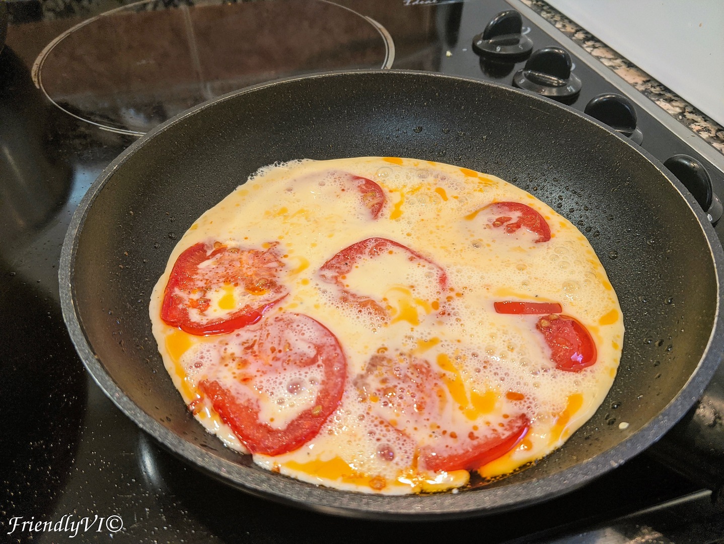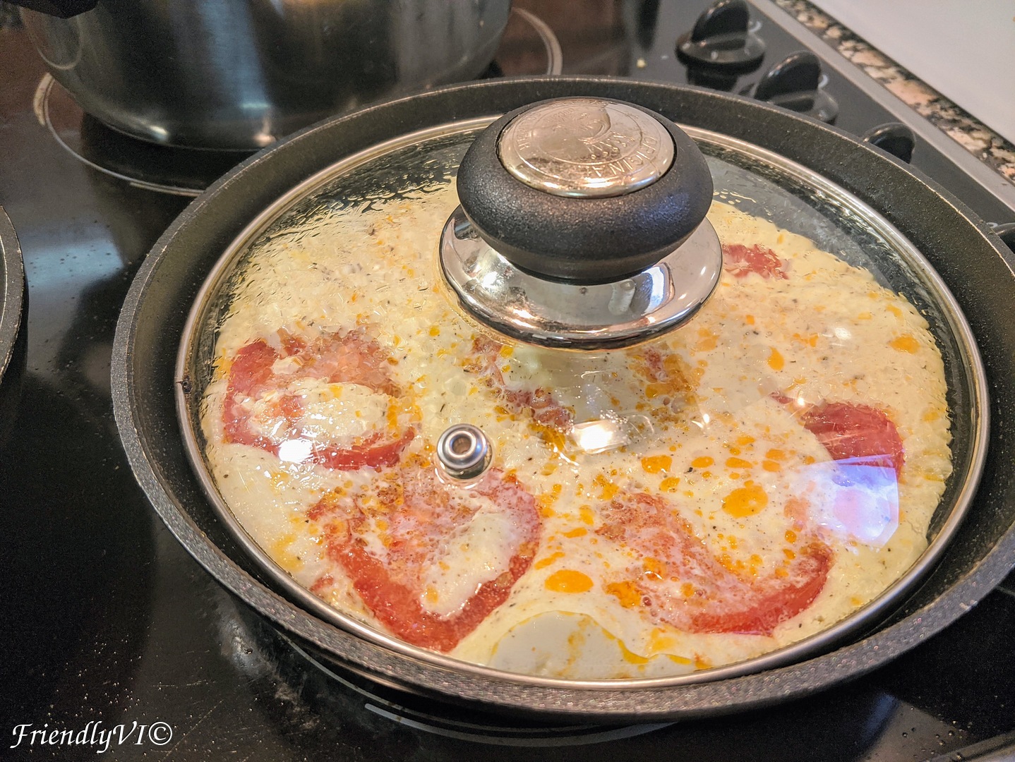 - Immediately place a lid on the pan and cook the omelette on low to medium fire until it foams a bit on the top and all the surface looks cooked.
