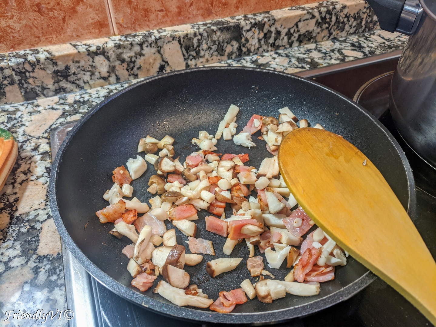 3. While the rice is boiling, cut the bacon/chorizo into small slices and fry it in a pan until it gets slightly brown.