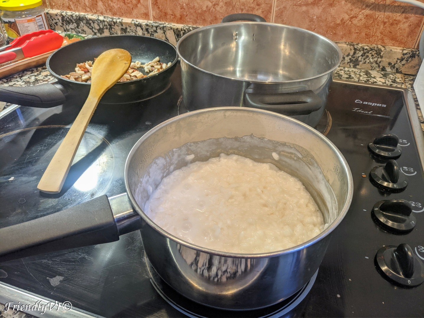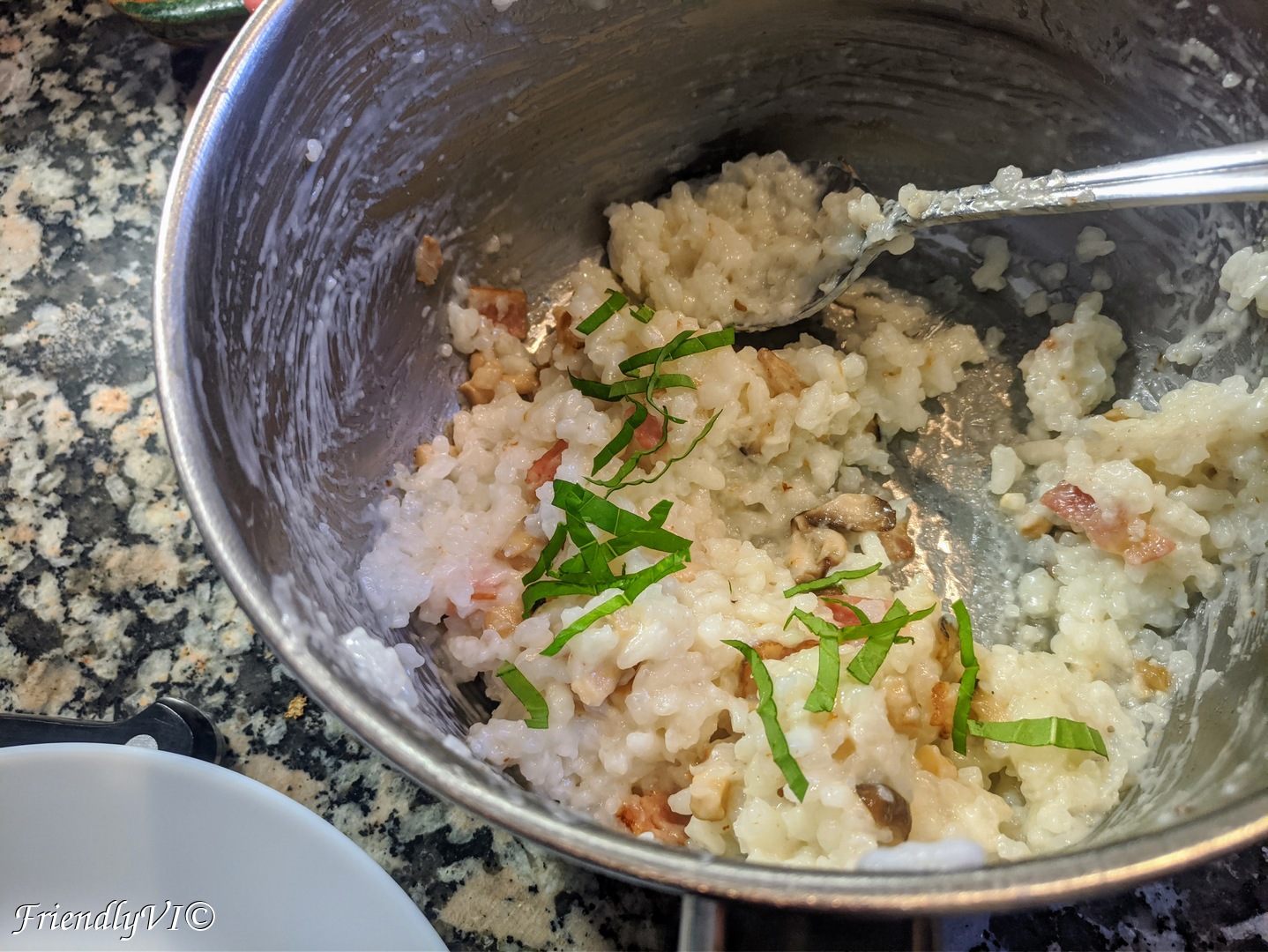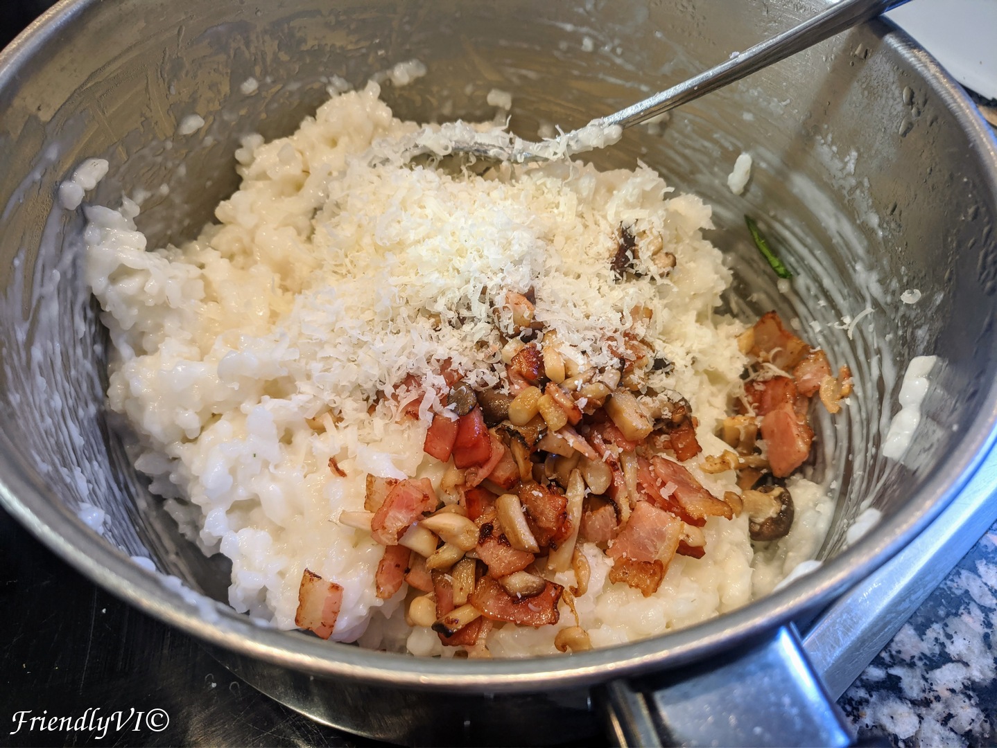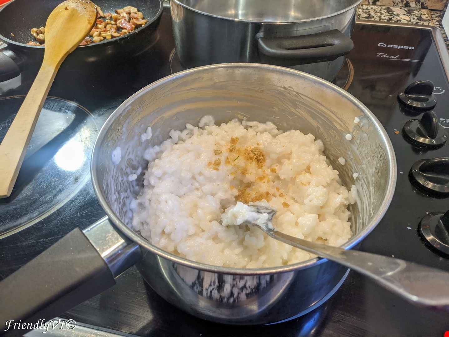 5. Once the rice is cooked, you can immediately add the bacon-mushrooms mix and the grated parmezan.