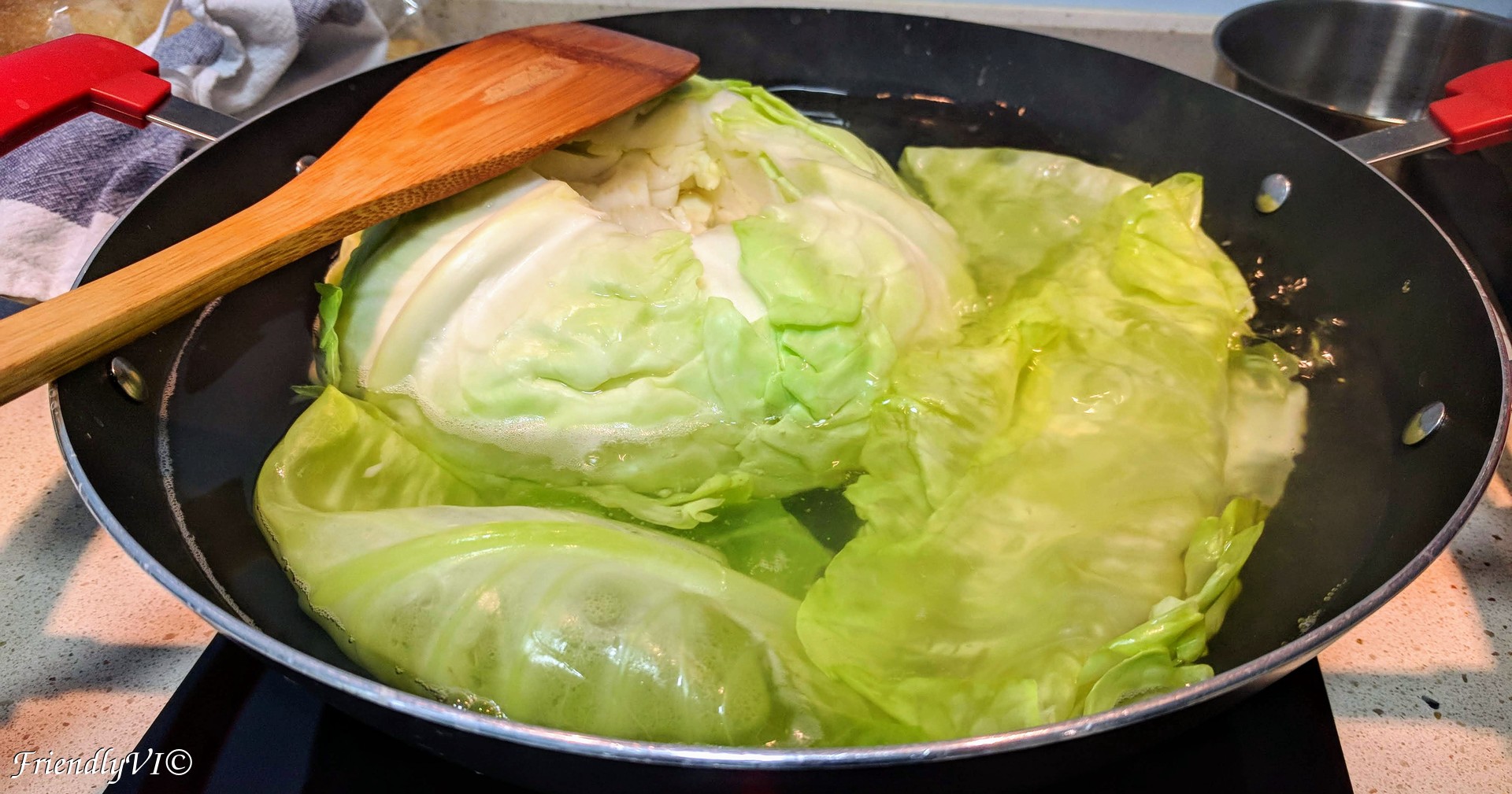 - Carefully place the cabbage in and let it boil until you can separate the whole leaves without breaking them.
