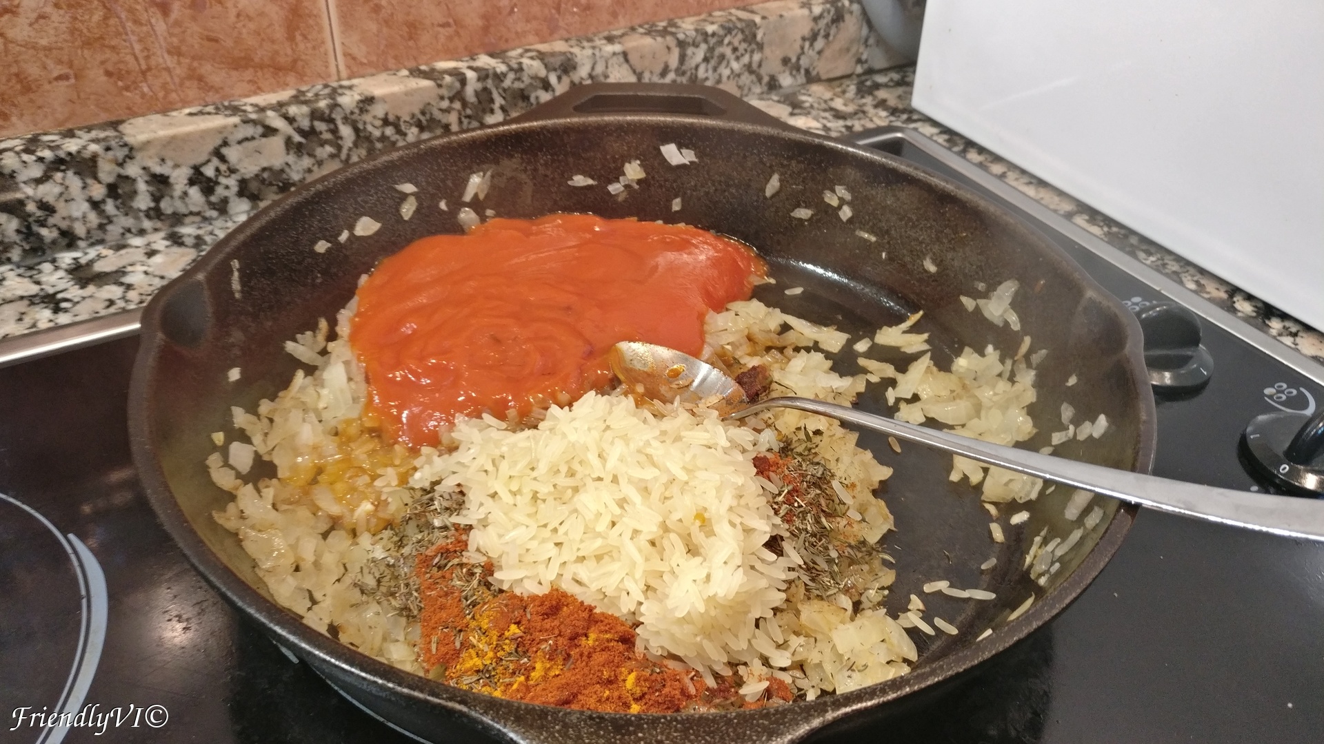 - You can now add the rice and the tomatoes and let the rice to cook half way. If the rice soaks all the liquid, add a bit more water.