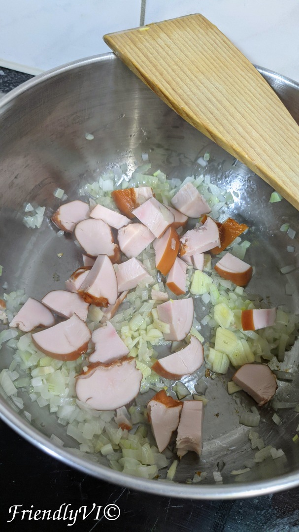 - Add the chopped smoked meat. Can be any type of smoked meat you find in your supermarket: chicken breast, pork or even sausage.