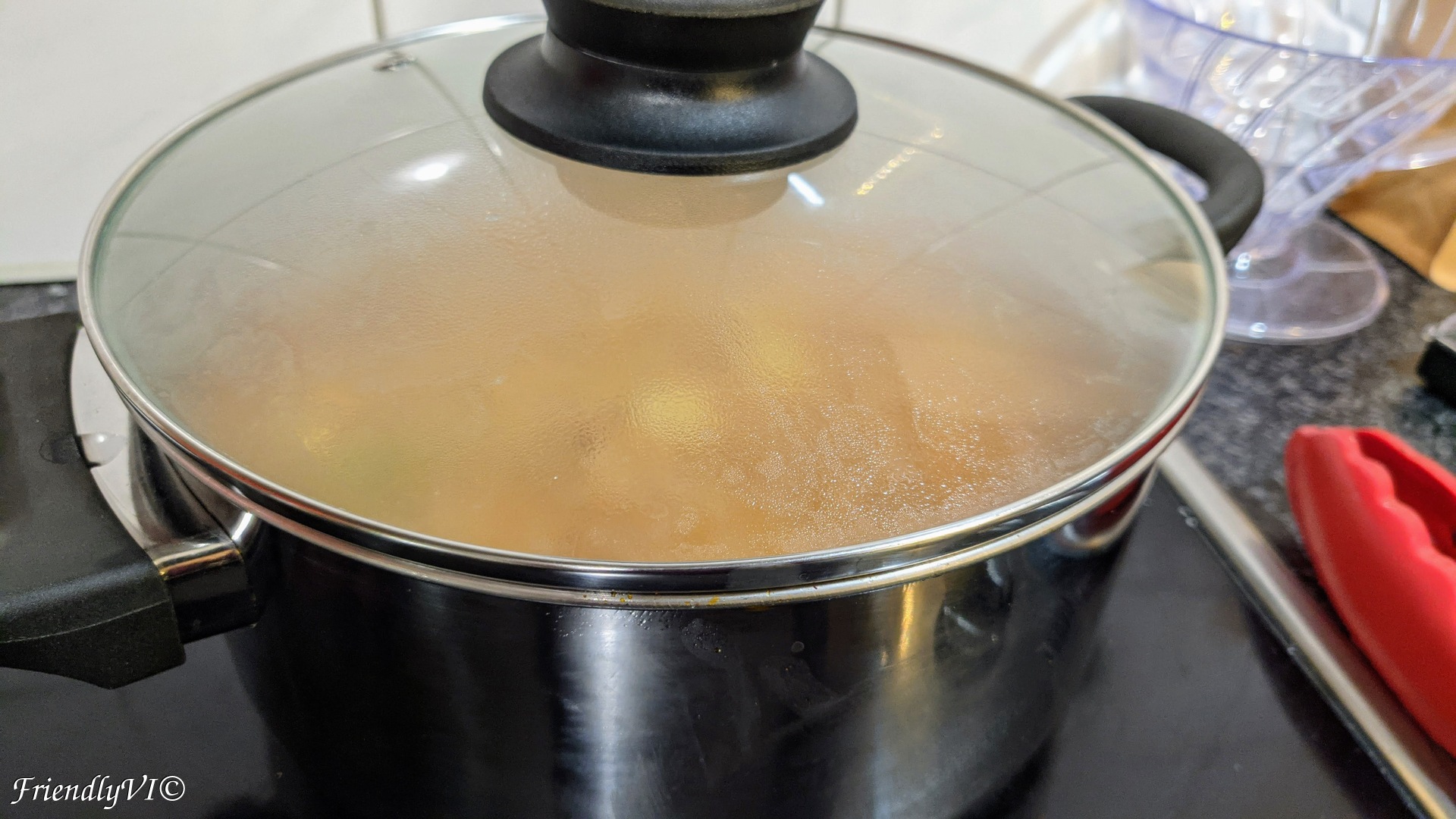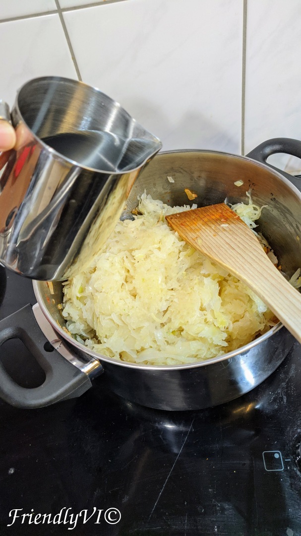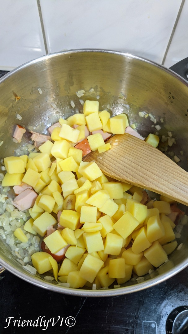 - Add the cubed potato together with the spices: bay leaf, pepper flakes, cumin seeds, paprika powder and black pepper.