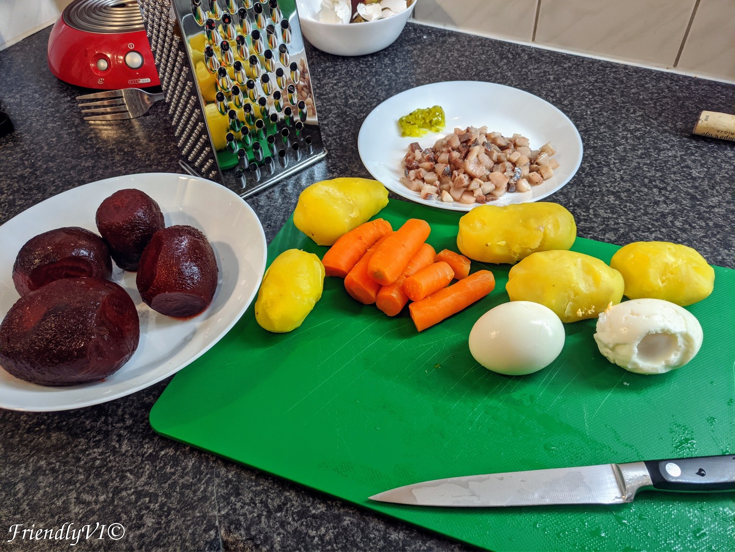 - Boil the carrots, potatoes, beets and eggs. I buy the beets already boiled.