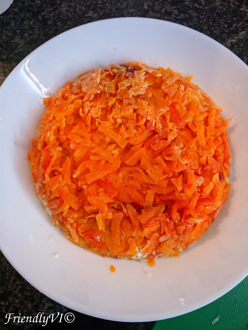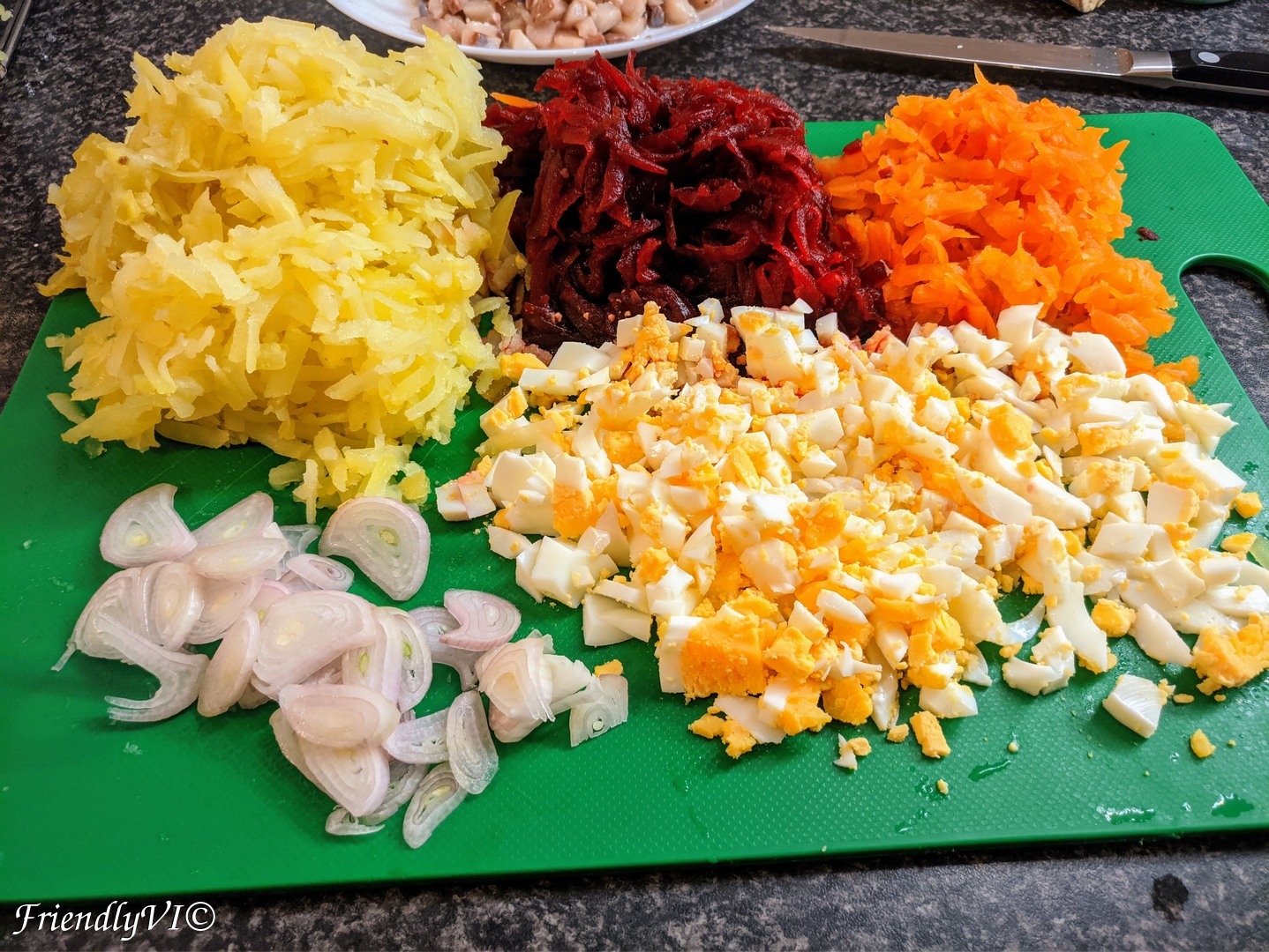 - Grate the carrots, beets and potatoes. Dice the egg and cut the shallot into round slices. The herring should be also cut into small cubes.