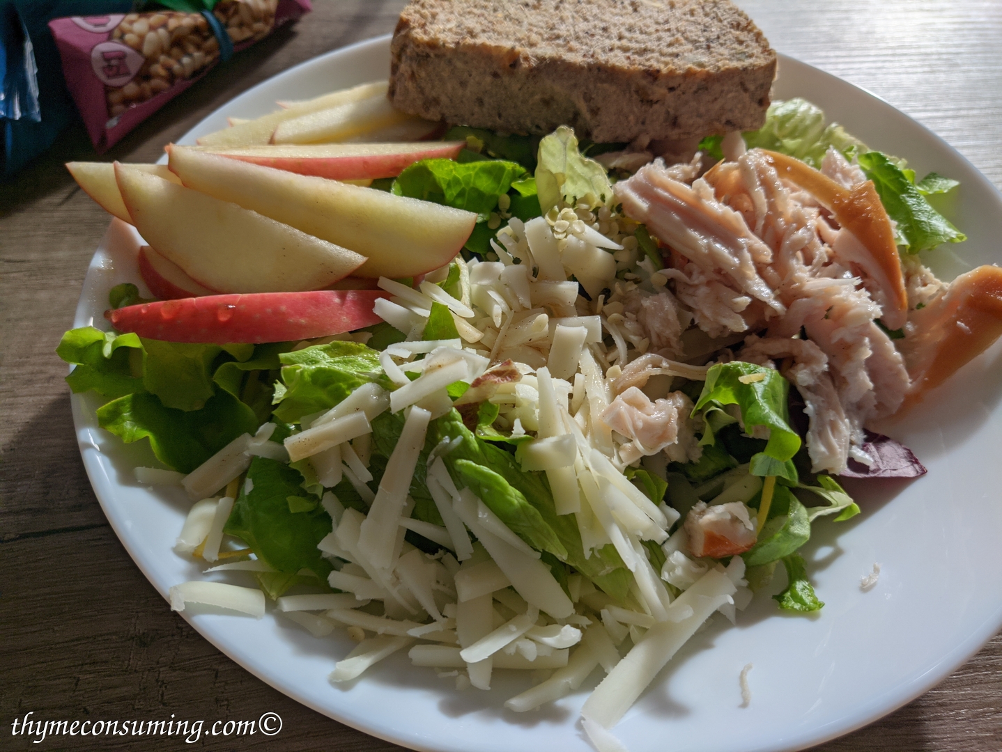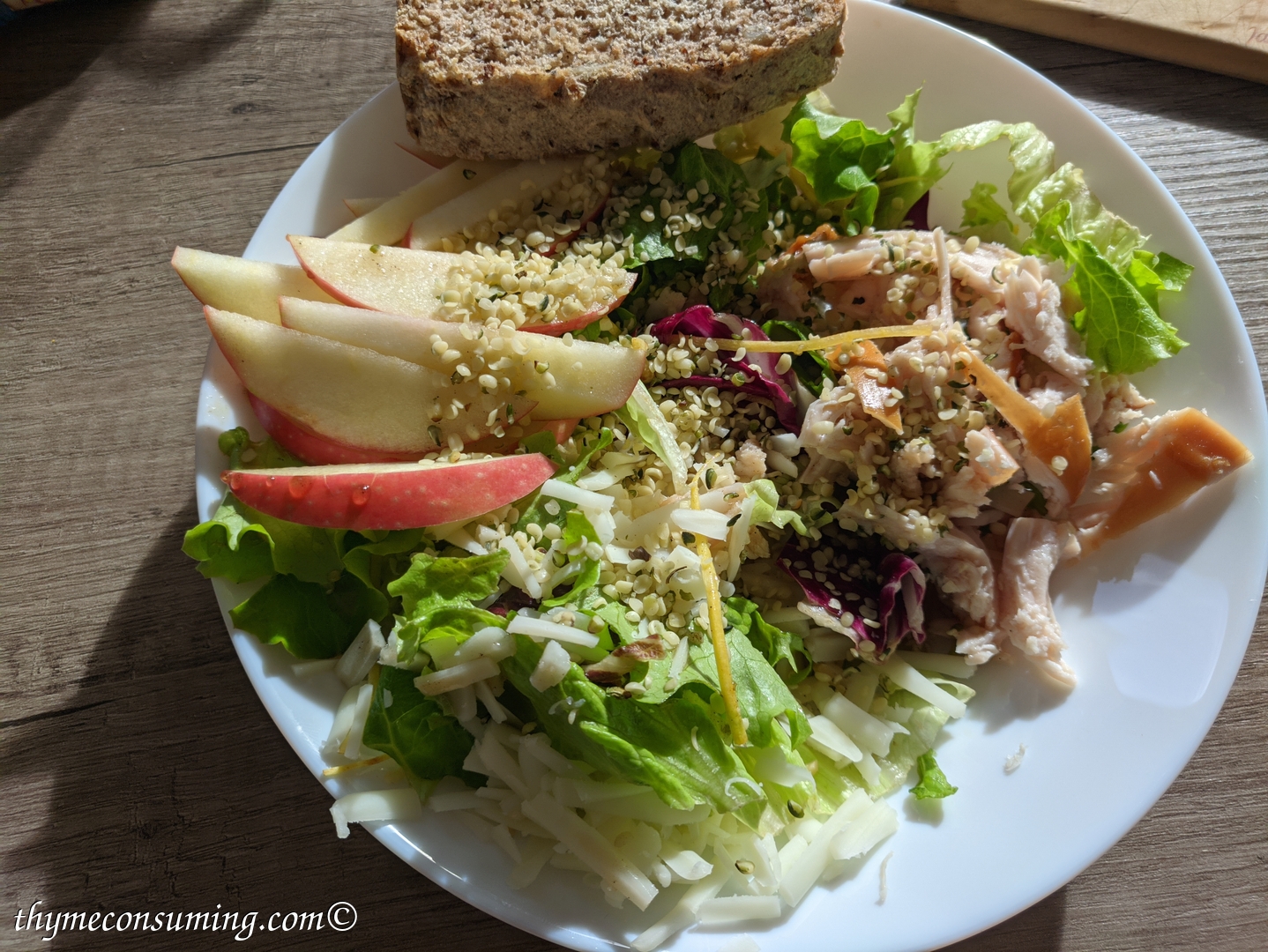 Add you favorite green salad, neutral works best in this case. Shred some store bought smoked chicken. Add some hard cheese, I find that sheep works the best. Chop some apple next to it. Sprinkle lots of hemp seeds. At the end add a vinaigrette made of a bit of honey, olive oil, salt and balsamic vinegar: