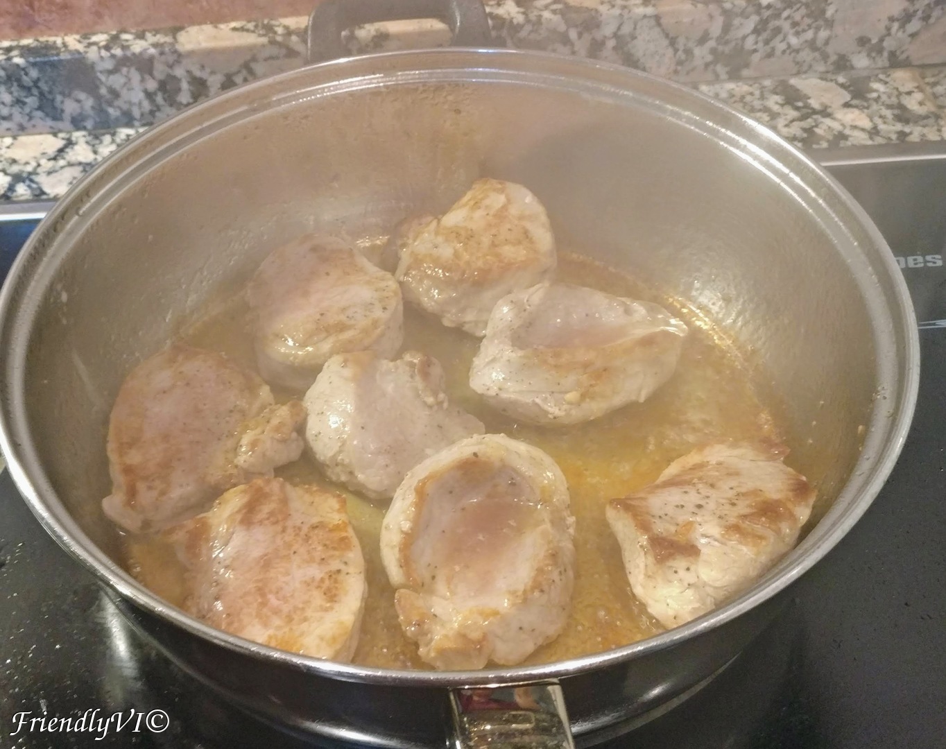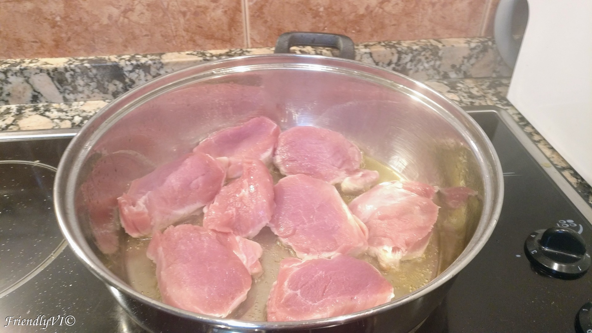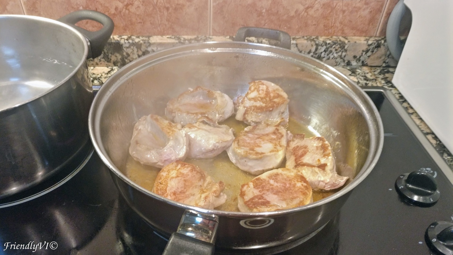 2. In a saute pan, start frying them in the hot oil on medium heat, until it browns on one side, 3-4 min. You can salt the meat on the uncooked part.