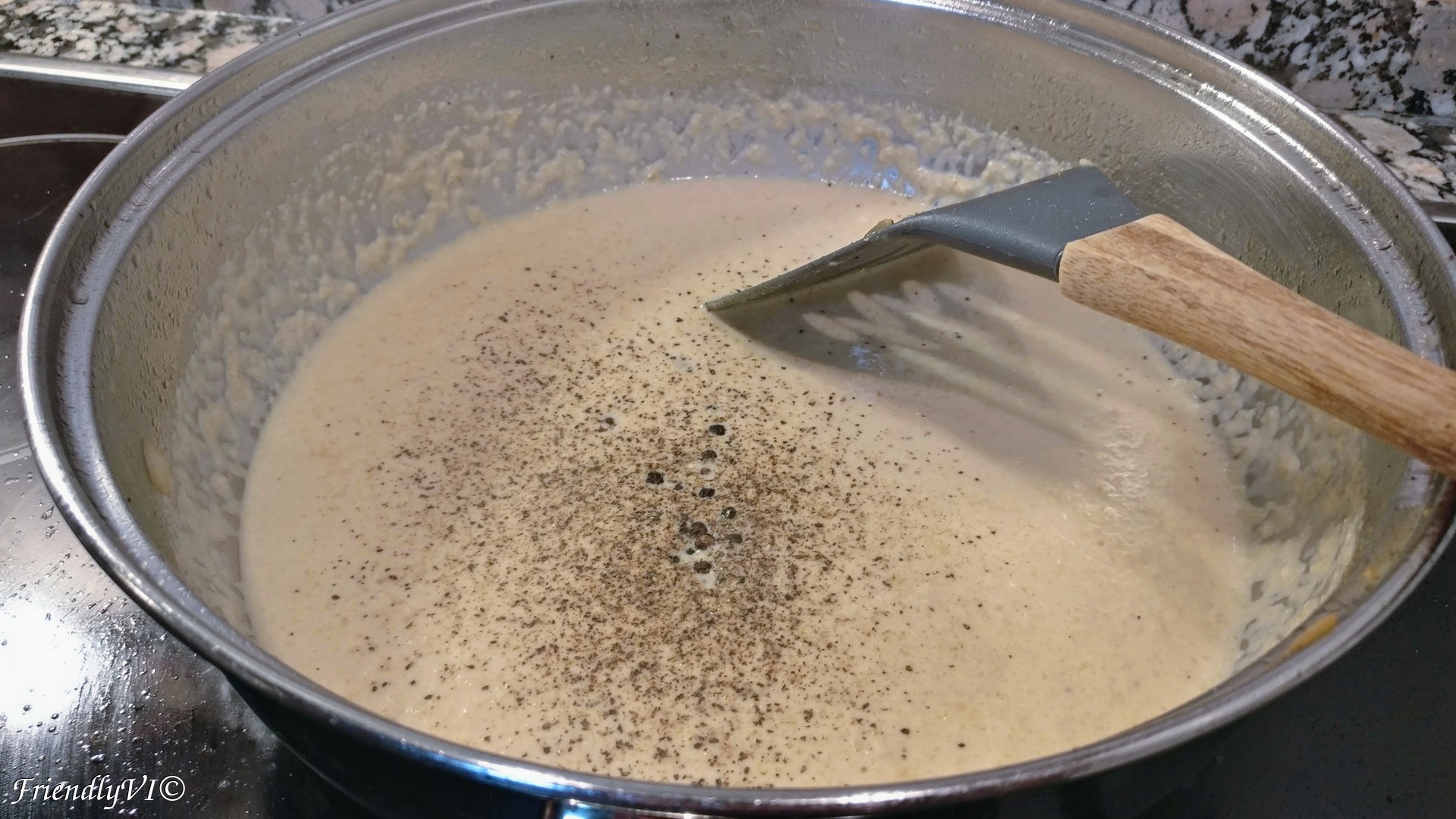 9. Move it back to the pan and add the heavy cream as well as the whole and ground pepper.