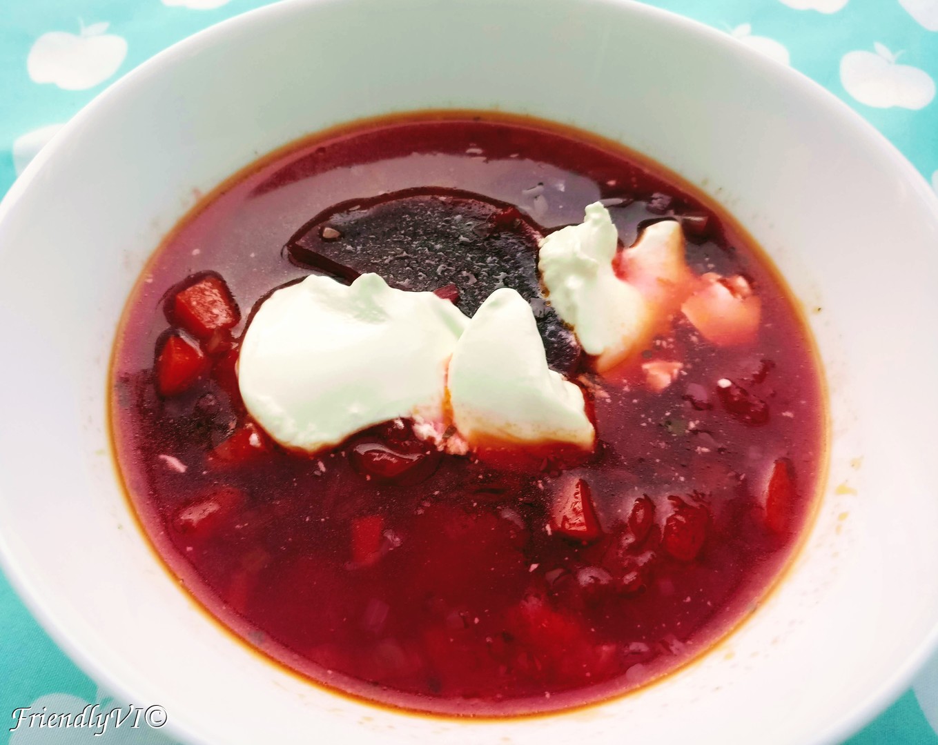 This beetroot soup is a sour and hot version, a pretty good combination even for summer. I am using the Romanian bors for making it sour (https://en.wikipedia.org/wiki/Bor%C8%99_(bran)), but lemon juice can work just as well. It is very fast to make, healthy and refreshing!