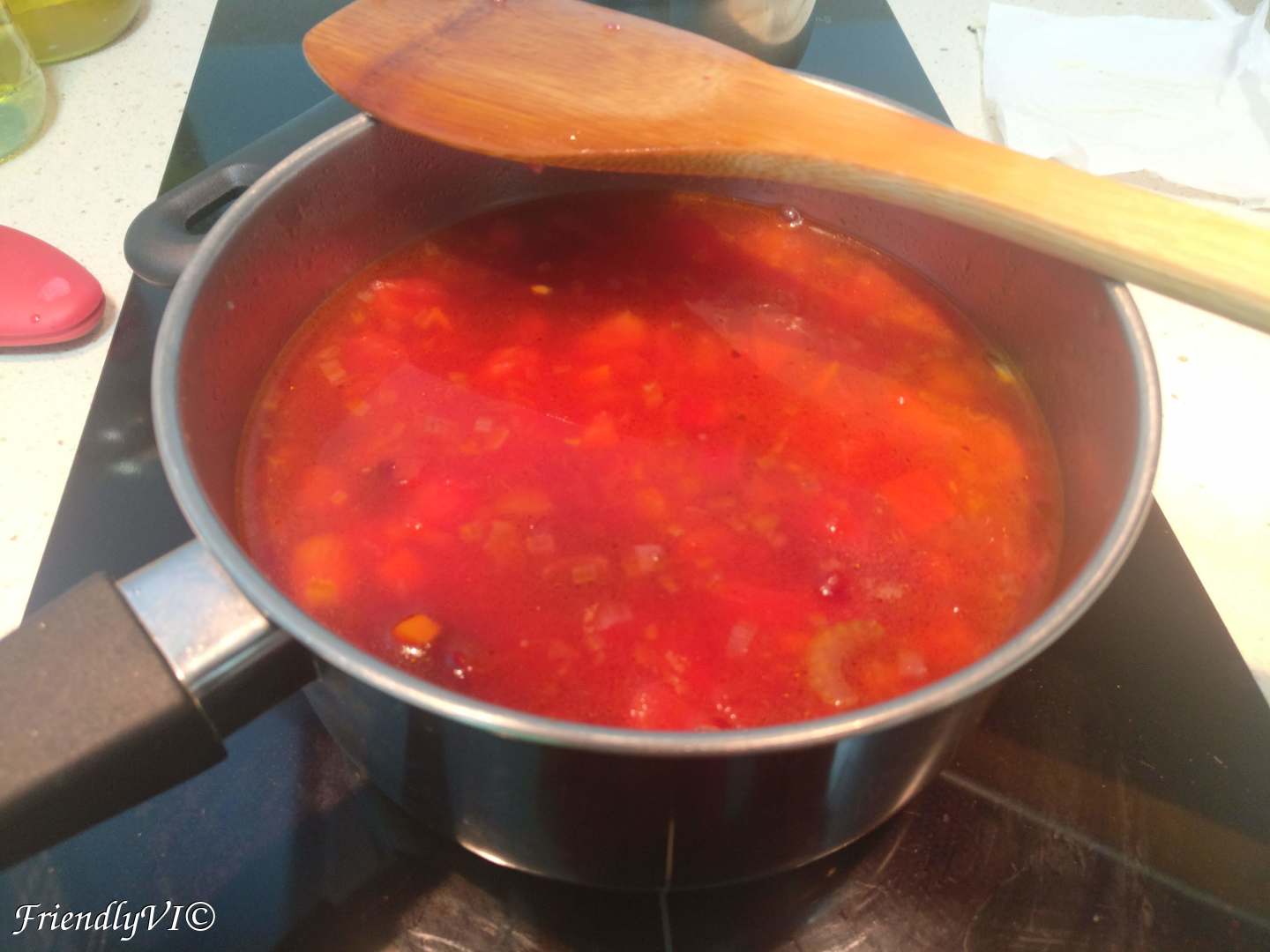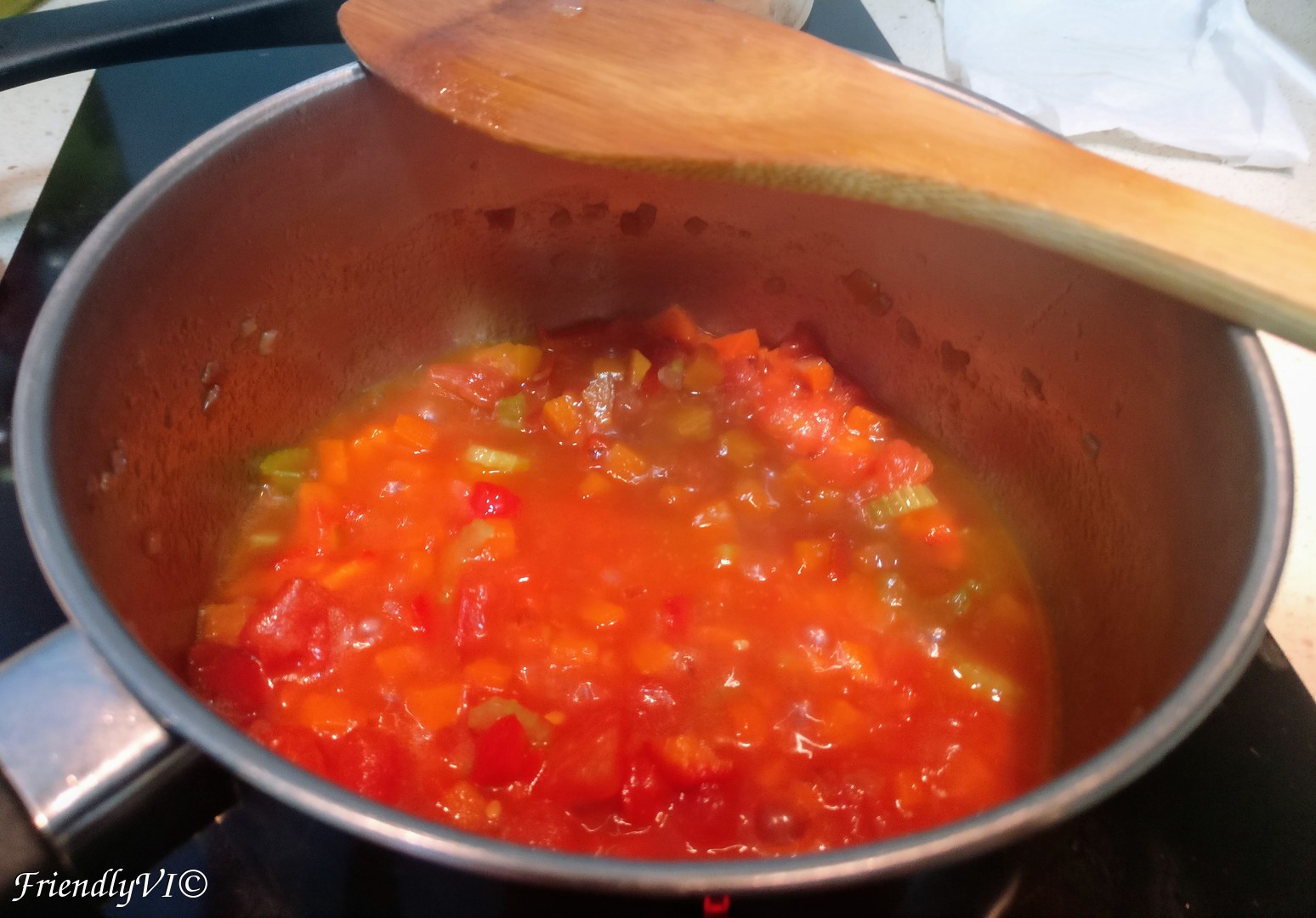 - In a pot pour 1-2 tbsp of oil and start sauteing the onion, carrots, pepper and celery and add the tomatoes at the end (preferably without the skin). Saute for 5 min.