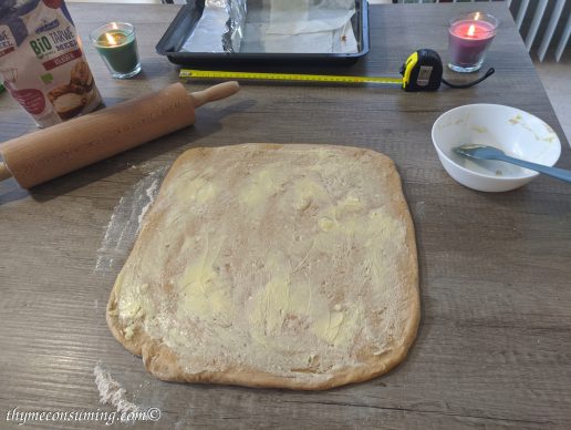 - Roll the dough into a 45 x 30 cm rectangular shape.