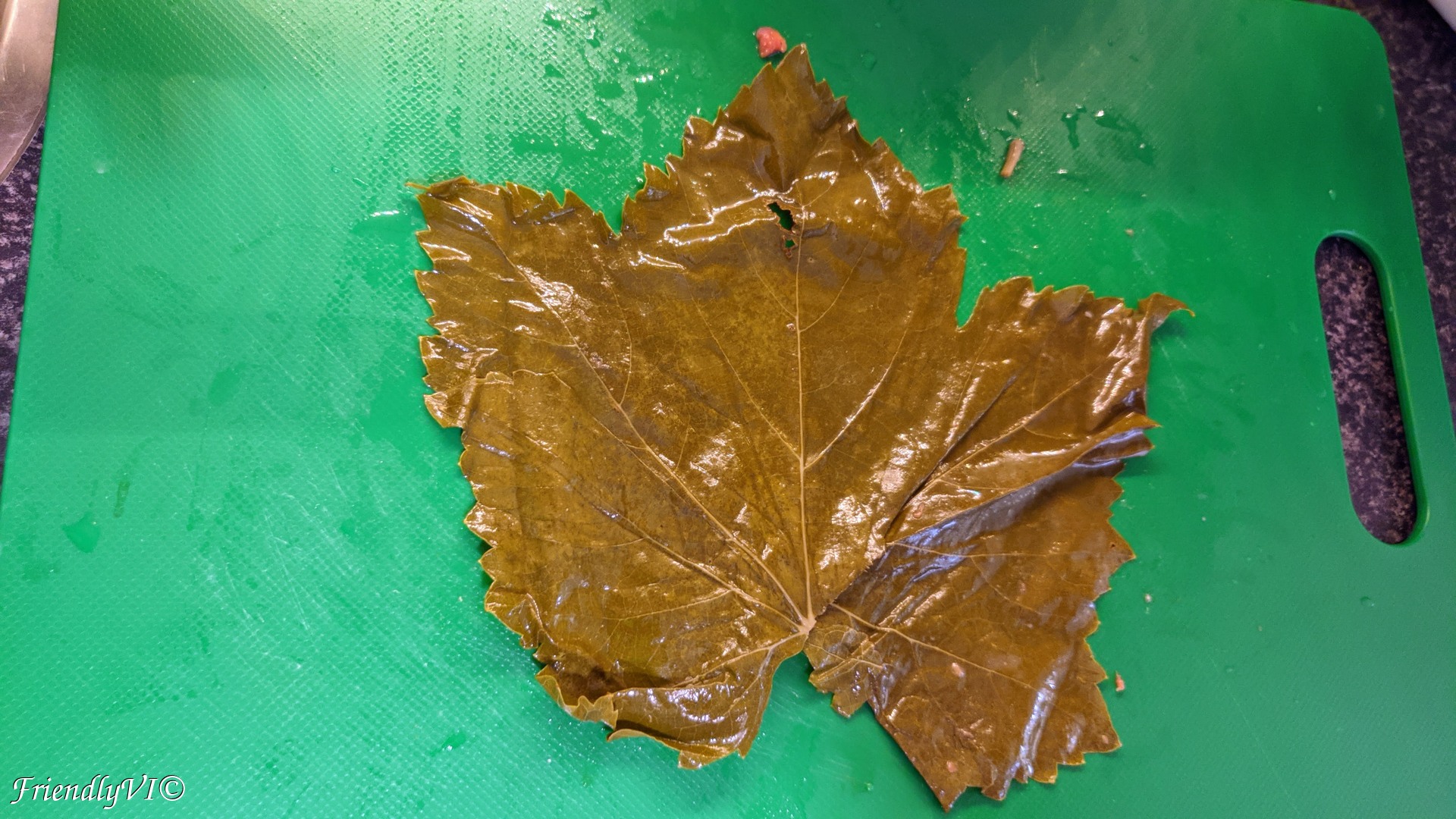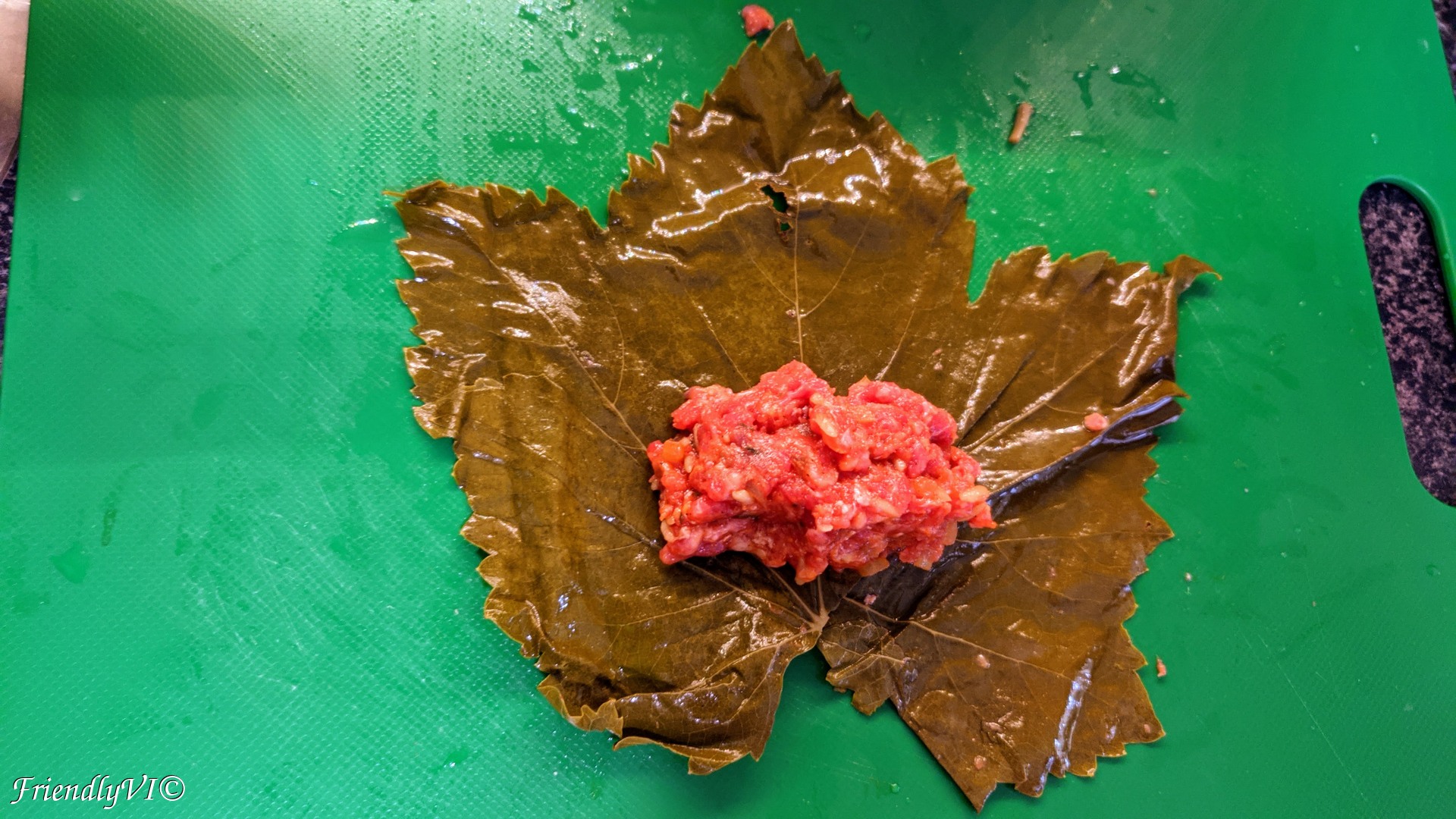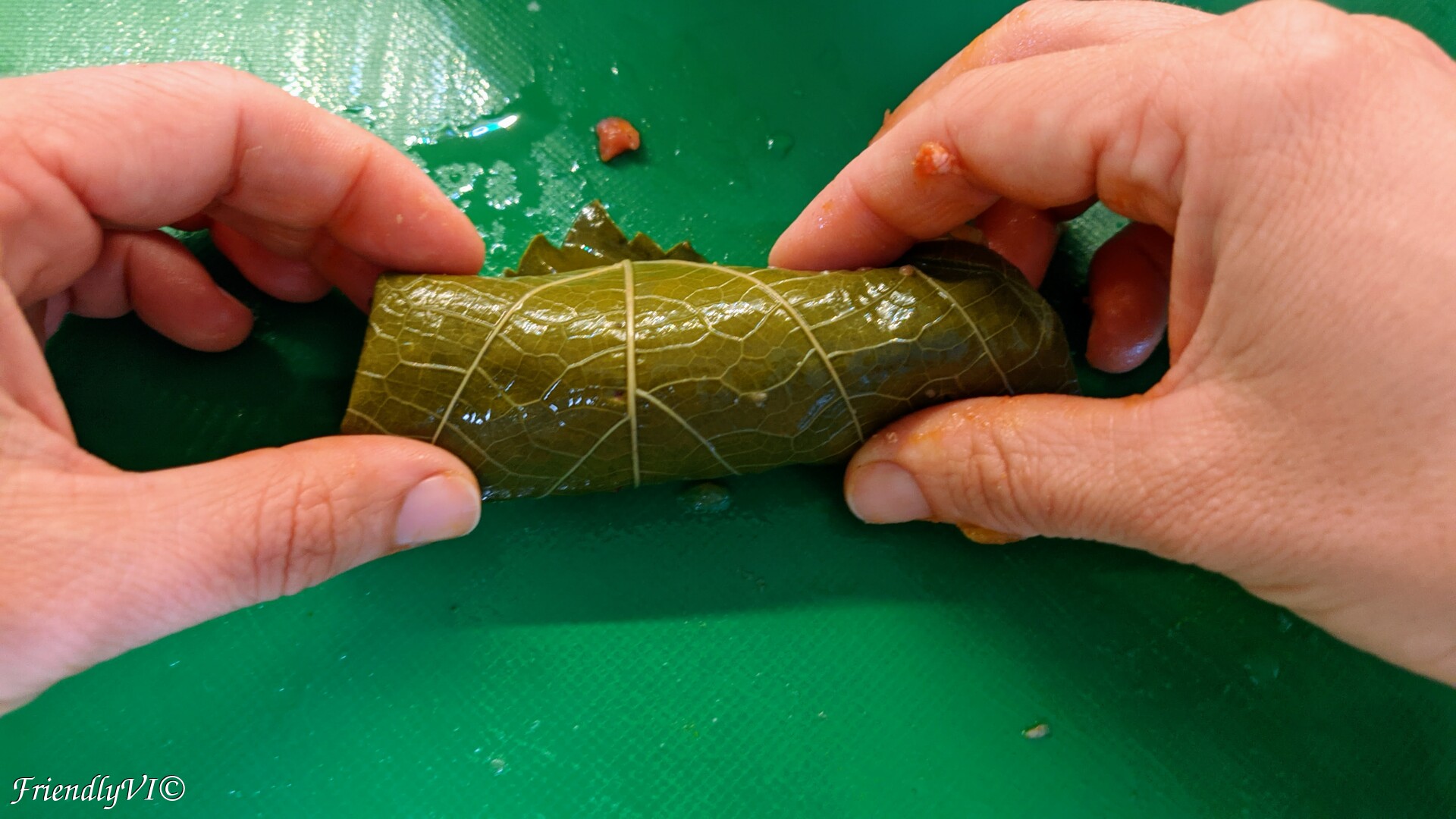 - Place a bit of the meat mixture in the middle of a vine leaf and wrap them as in the picture.