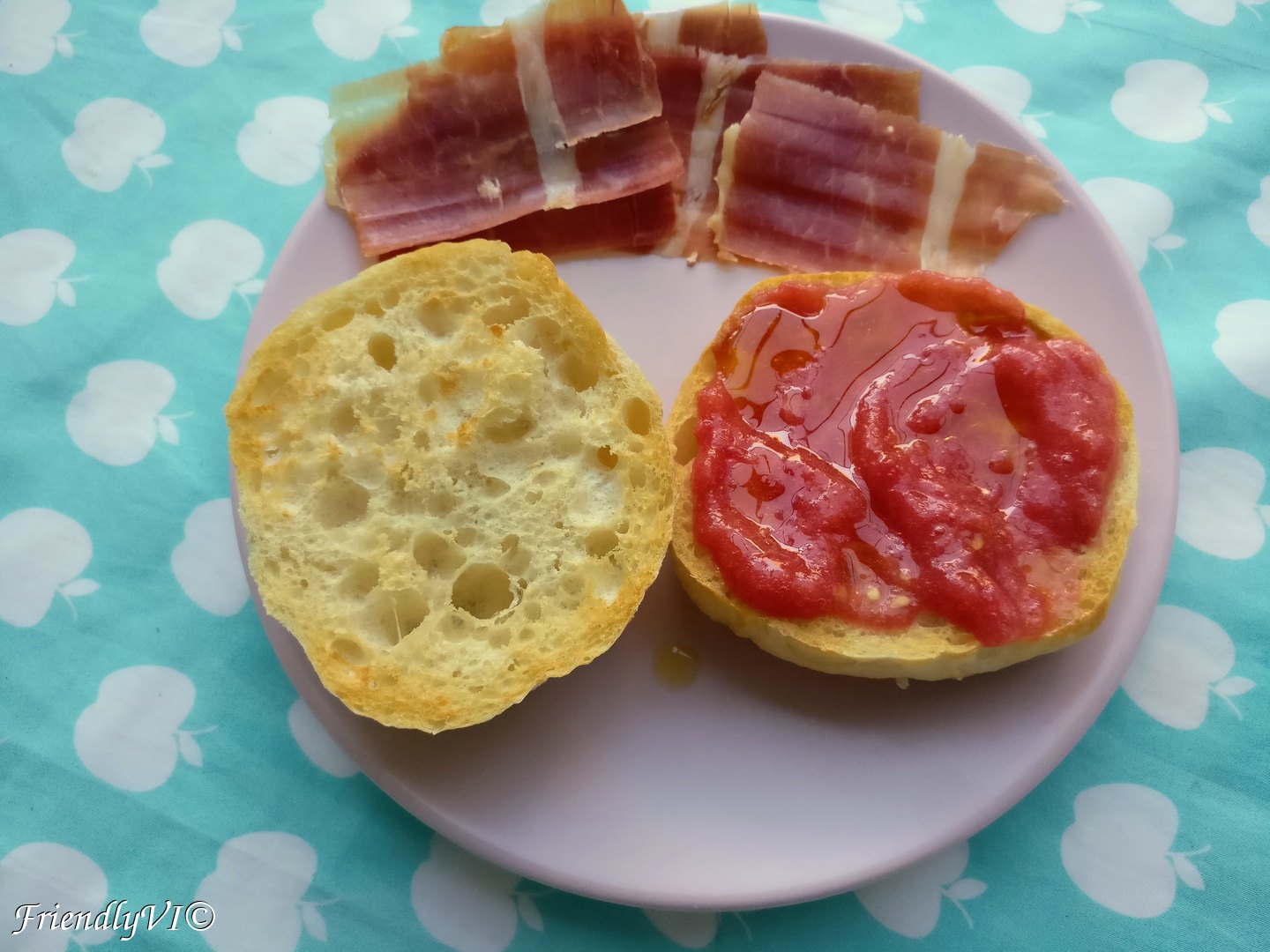 And here is how you eat it the Spanish breakfast in the Spanish way: toast your bread until it’s golden. Cover it with some decent amount of freshly grated tomatoes with no skin or seeds or spices. Sprinkle olive oil. Add the jamon serrano on it and start one of the best days of your life!