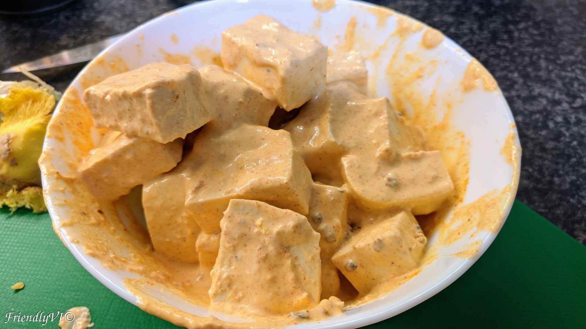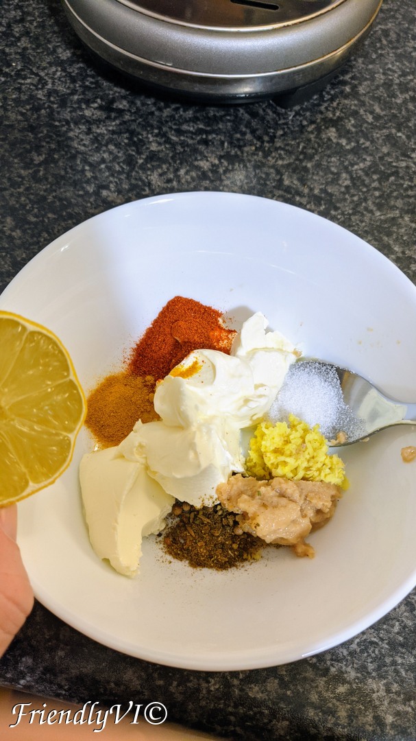 - Make the marinade for the tofu: yogurt, garlic, ginger, paprika, turmeric, Garam Masala, salt and lemon juice.