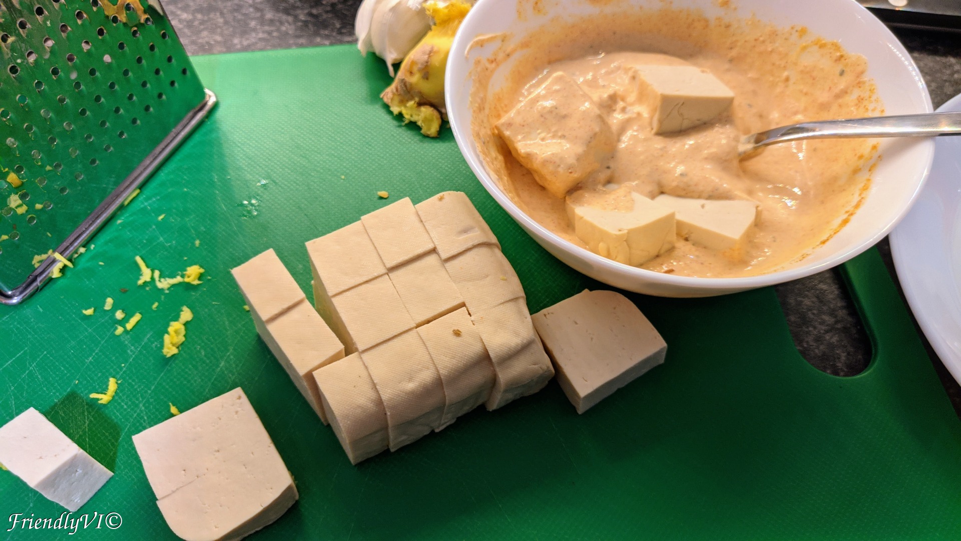 - Cube the tofu that you pressed with something heavy for min 30 min.