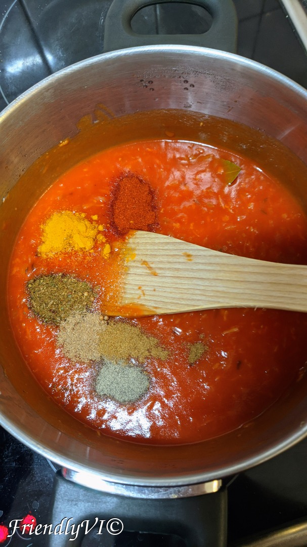 - Add the tomato sauce and the spices: paprika, turmeric, Garam Masala, coriander, cumin, sugar, black pepper and salt to taste.