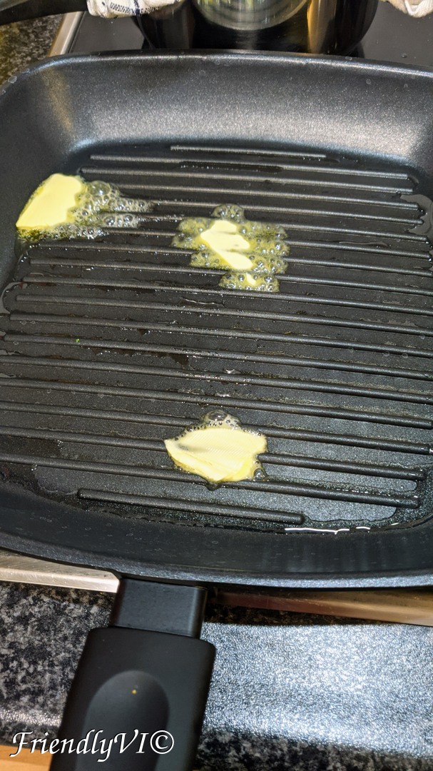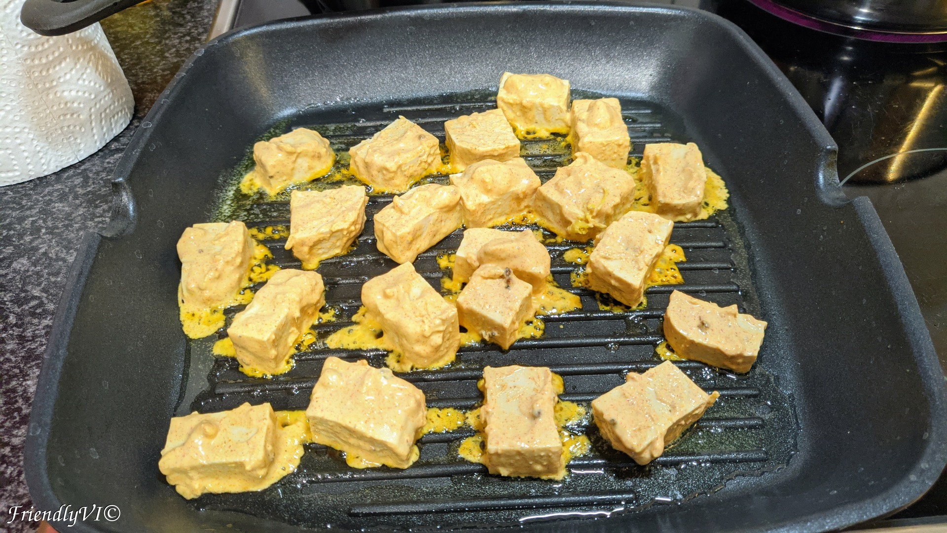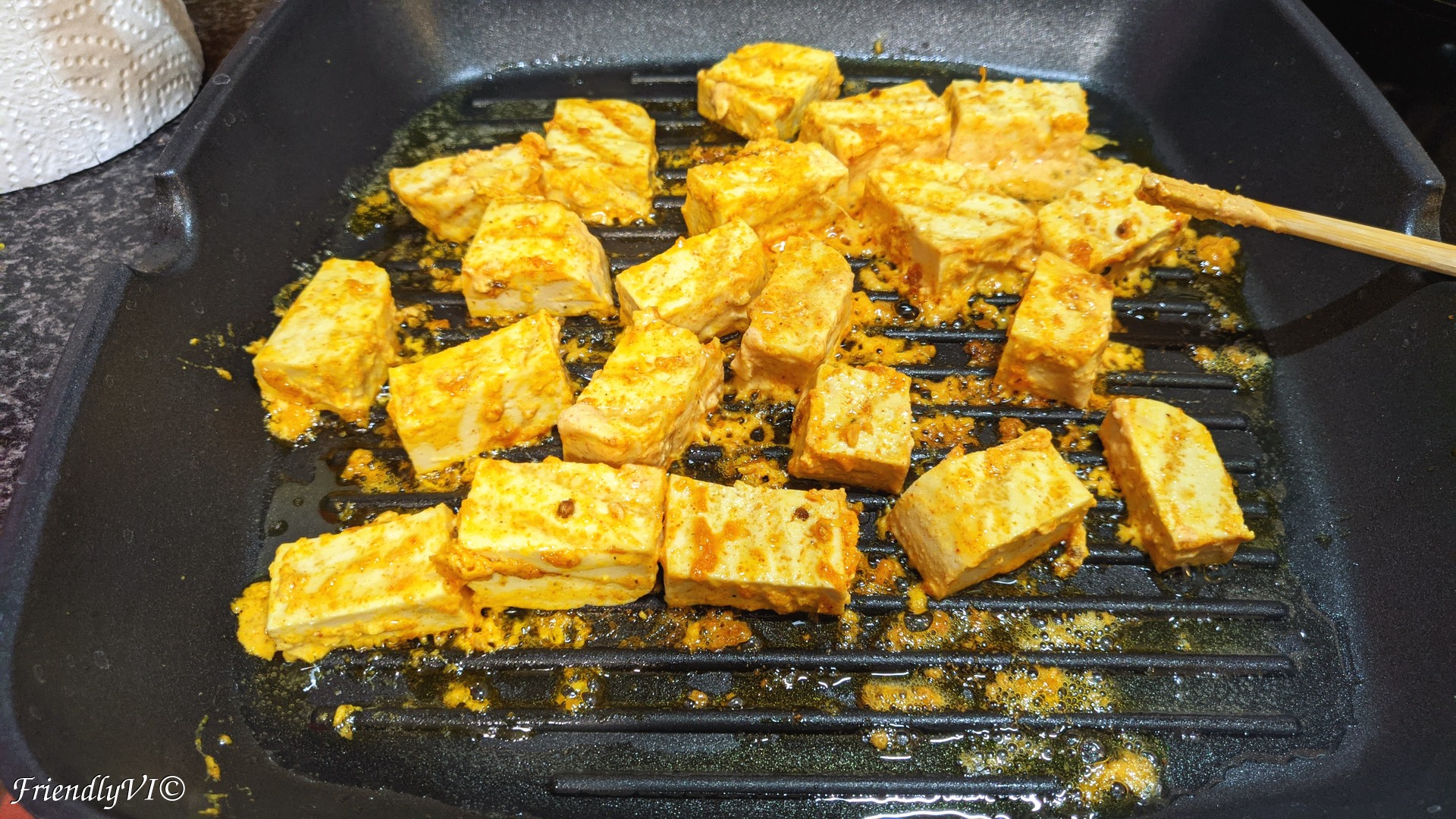- In the meantime, in a buttered pan, grill the the tofu on all sides.