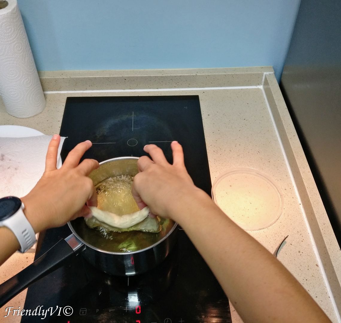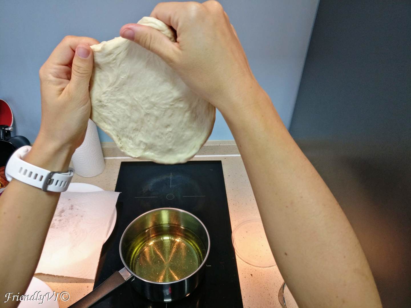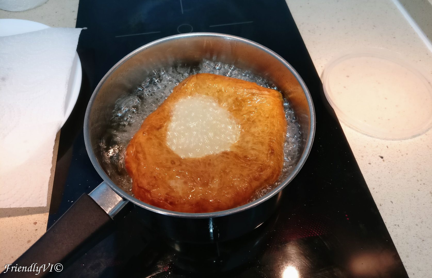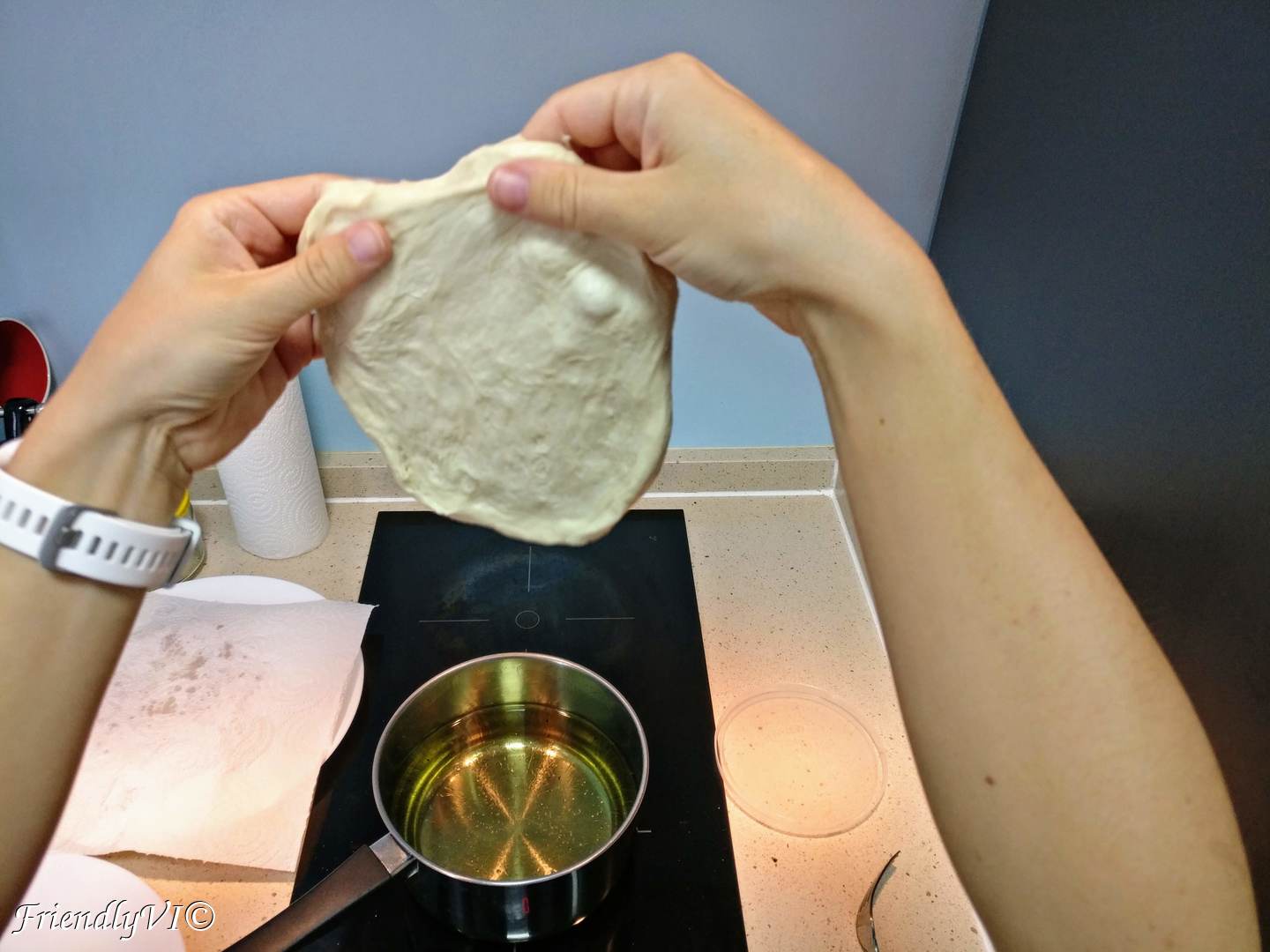 - Drop the dough carefully in the pan and don’t be scared by the evaporation reaction.