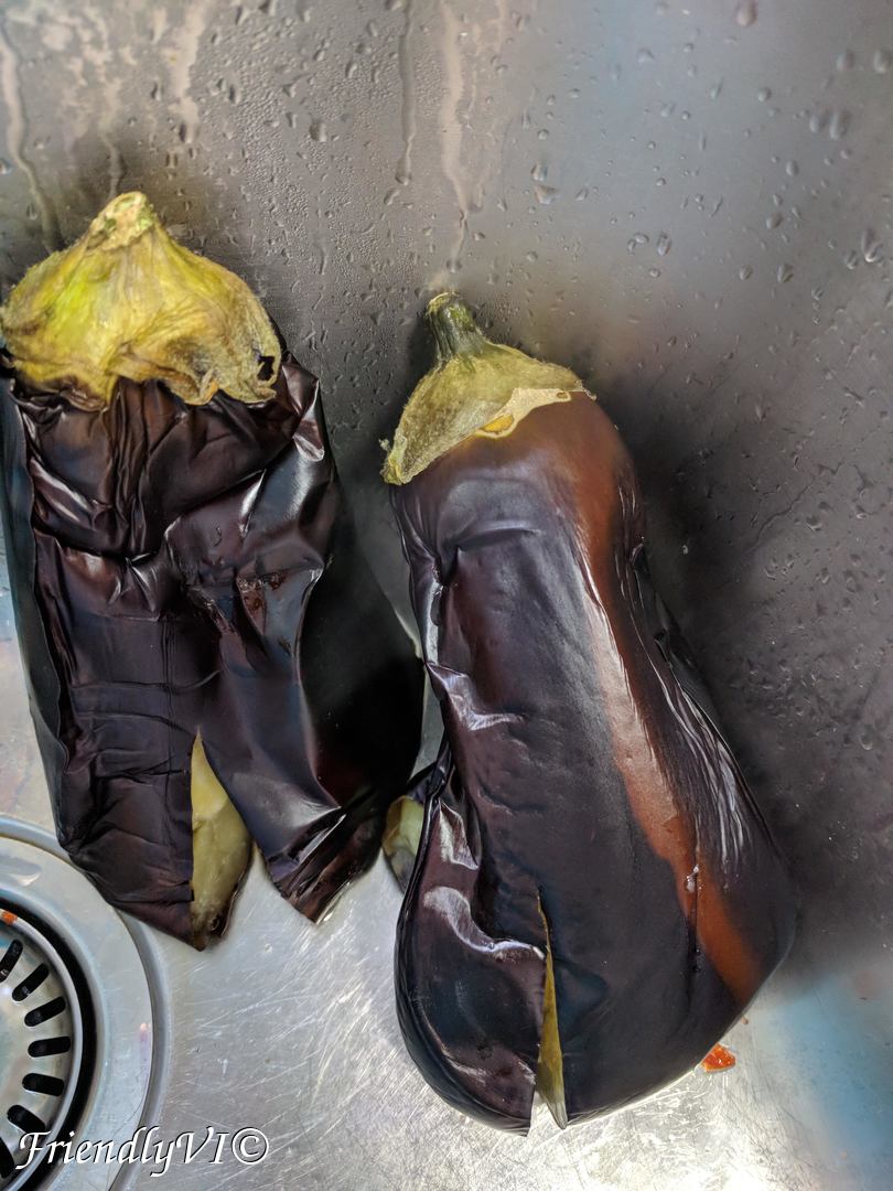 - Cut the top of the eggplant and let them strain until they are cool enough to be cleaned.