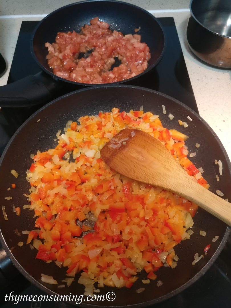 - Add at the end the chopped tomatoes. I always peel the skin, but if you like it you can keep it. If you want this to be quicker you can fry the tomatoes at the same time in a different pan. But adding it at the end and letting the tomatoes soften for 10 min works too.