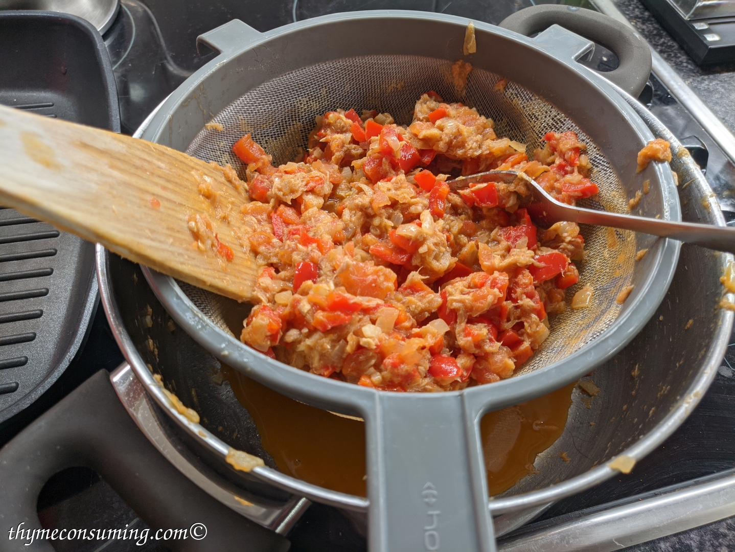 - Season with salt, pepper, paprika and let it cool of a bit in a strainer, so that additional liquid will sieve through.