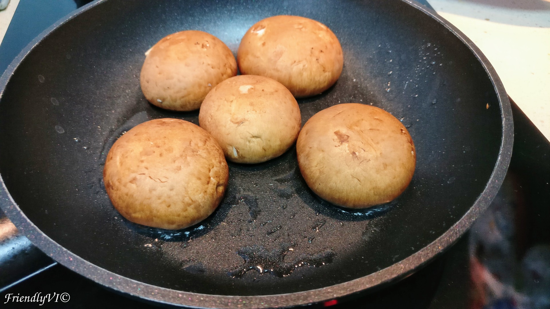 - Add the washed mushrooms upside down in a medium hot pan with a bit of oil.