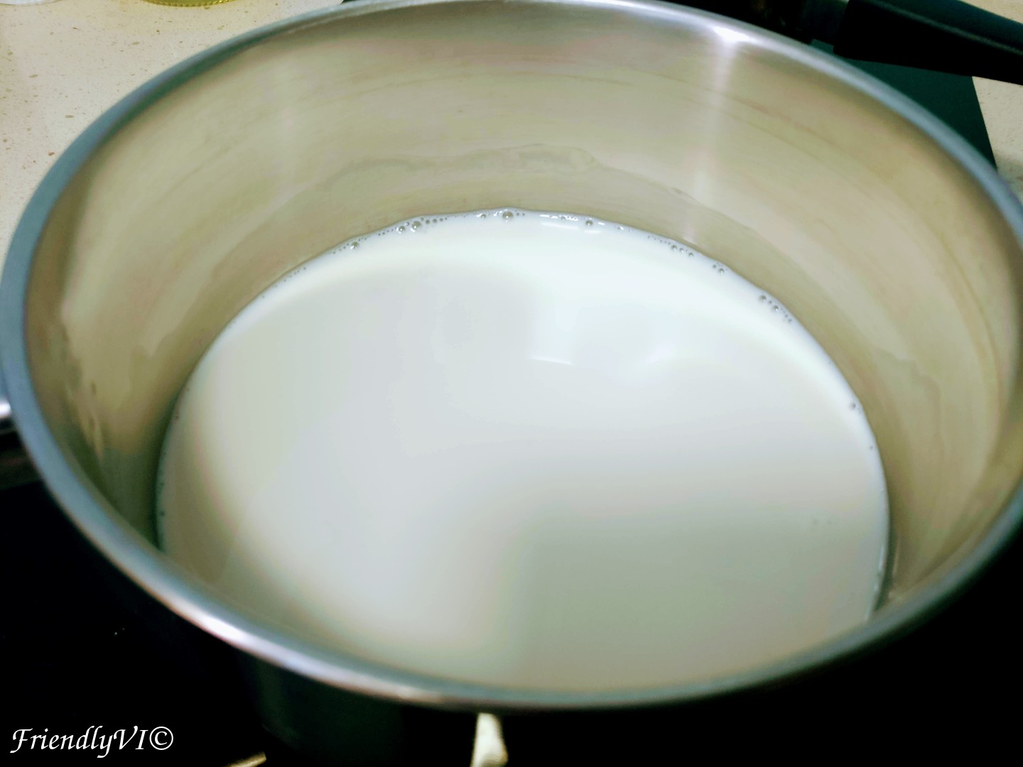 - Warm up the milk together with the vanilla essence and bring it under the simmering point.