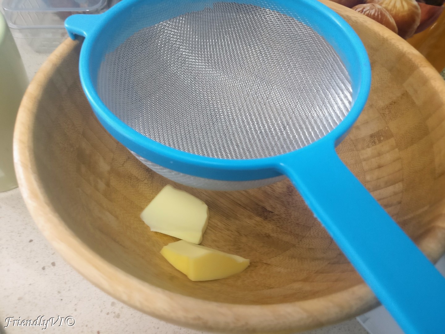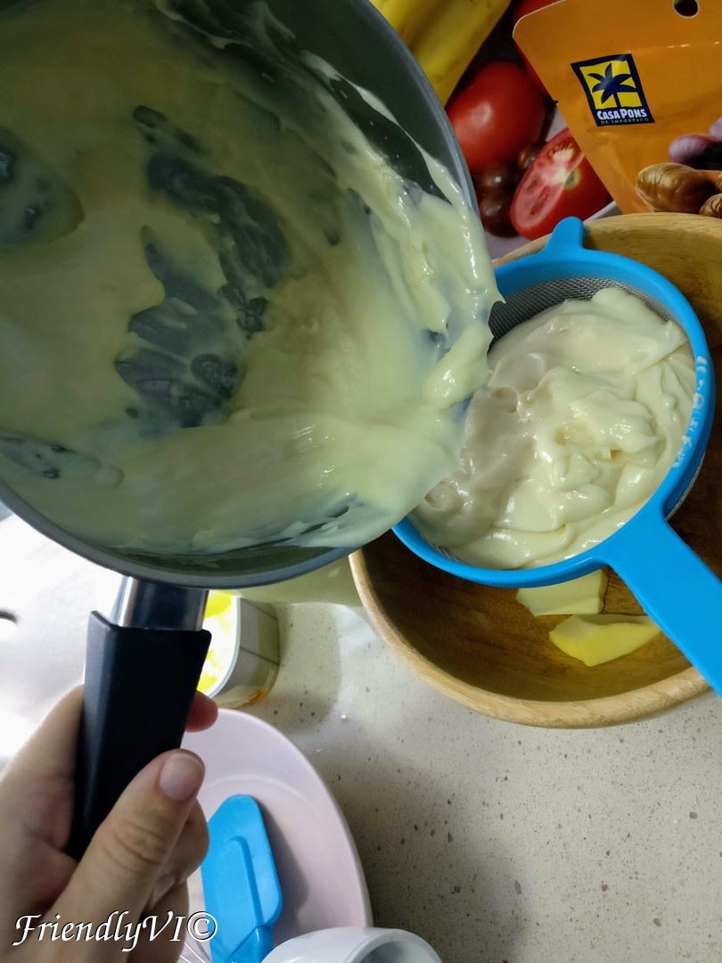 - Prepare a bowl with the butter on the bottom and a strainer above for passing the hot cream so that it won’t form a film after cooling down.