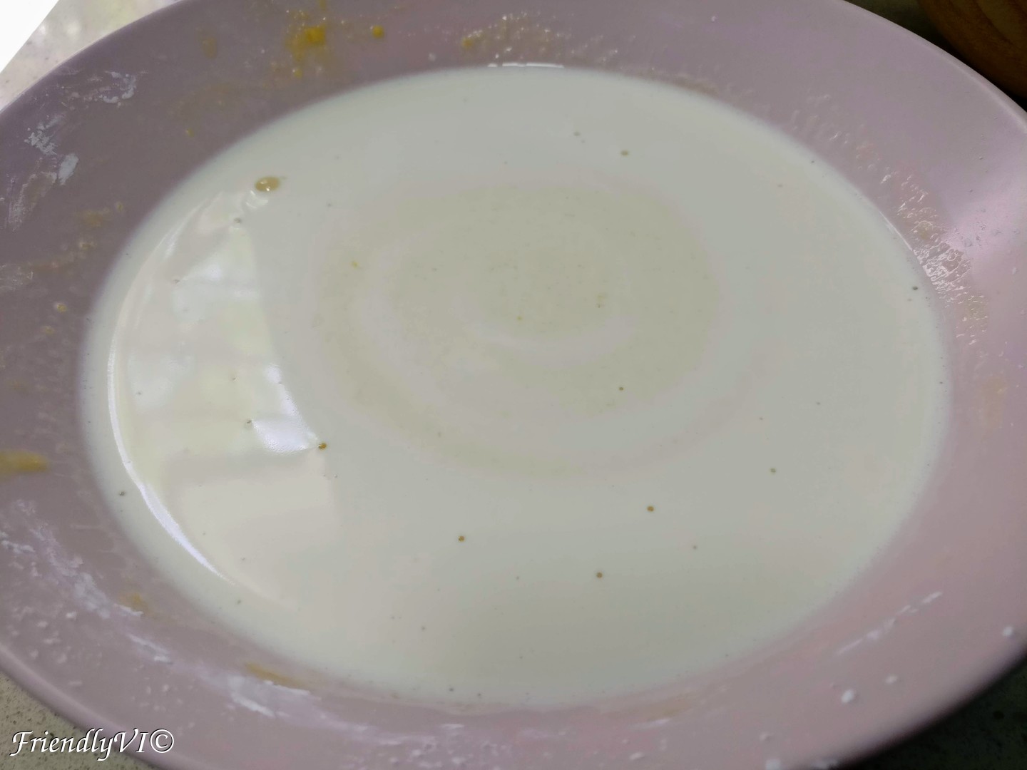 - Pour in the egg mixture a bit of the hot milk for tempering the eggs. This is for preventing transforming the whole thing into an omelette.