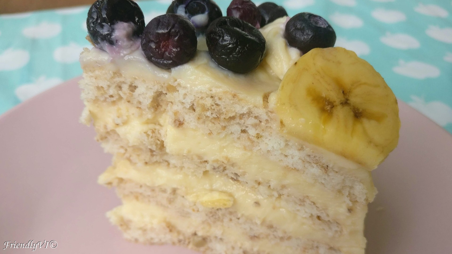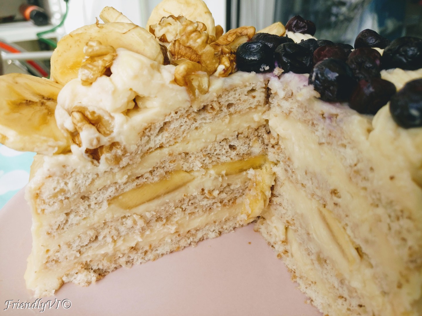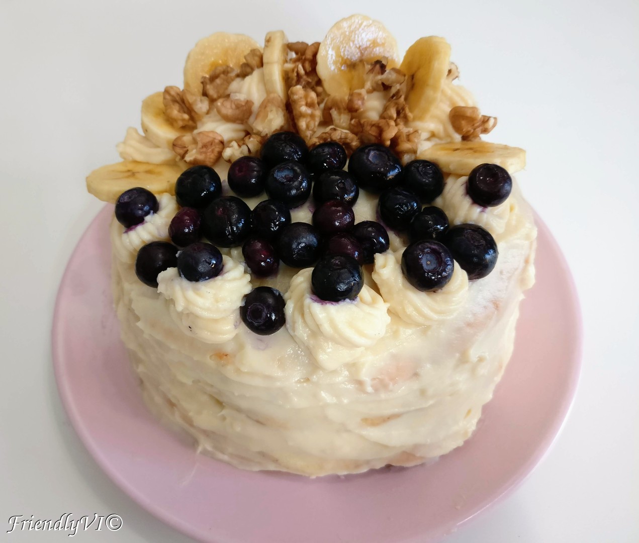 I decorated this cake with blueberries, walnuts and platanos and even put a layer of platanos in the middle of the cake. Now, if you wonder what platanos are, that is good, you really need to know about it. Imagine a fruit more delicious than a banana! Platanos are basically tinnier bananas grown in the Canary islands and a lot more flavorful and compact than bananas. If you see it next time in the exotic section of the supermarket, try them out!