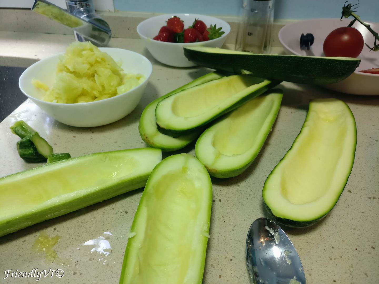2. In the meantime start carving the zucchinis with a spoon an keep the middle for the meat mixture.