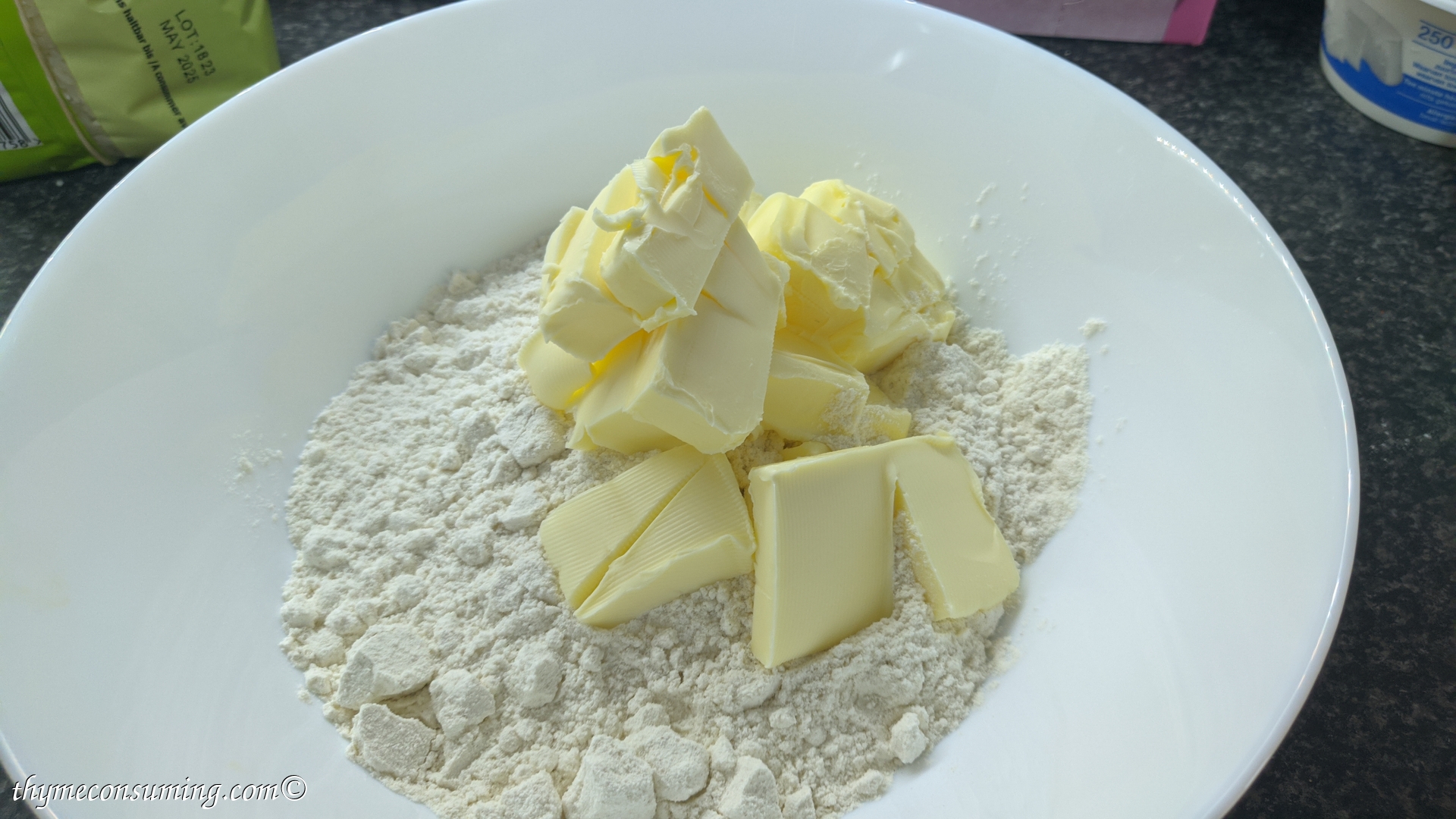 - In a bowl put the flour and the salt and add the cubed cold butter.